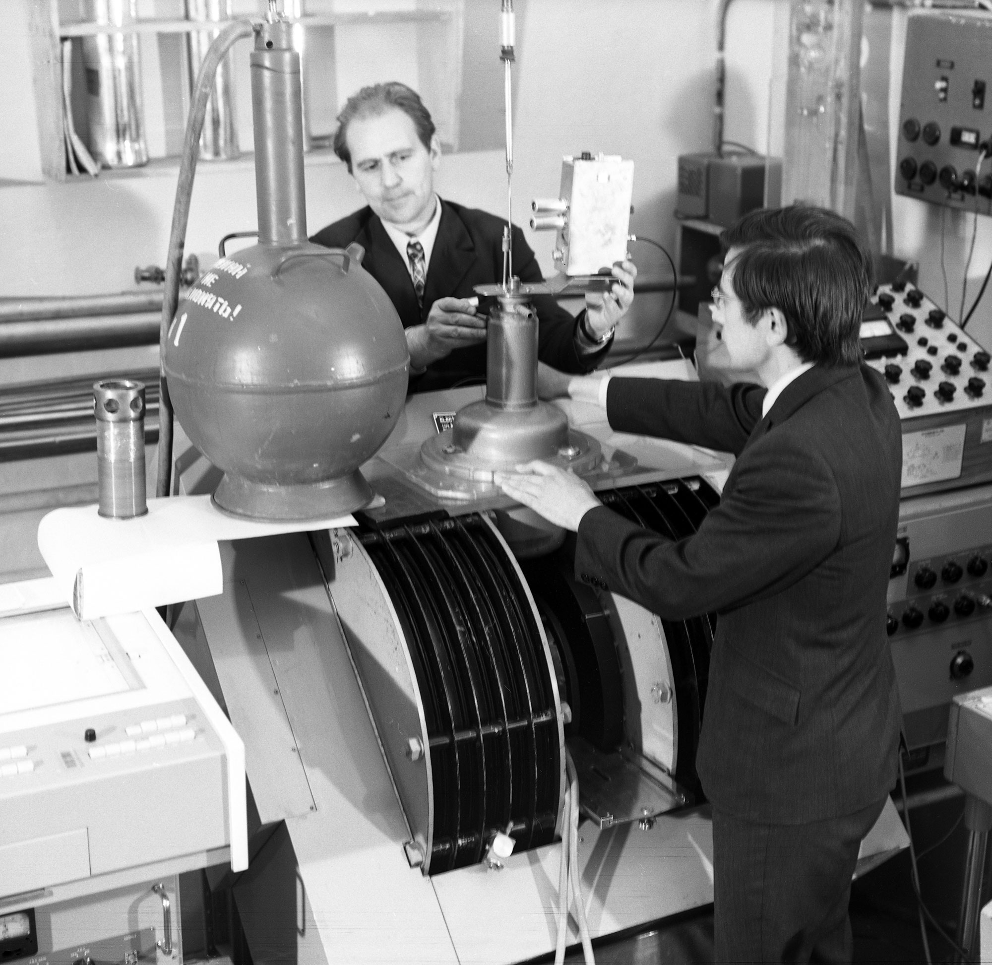 Заведующий лабораторией радио-спектроскопического структурного анализа Института физики им. Л.В. Киренского Сибирского отделения Академии наук СССР Зеер Э.П. (слева) и старший научный сотрудник лаборатории А.И. Лившиц у японского ЯМР спектрометра JNM-3H-60.