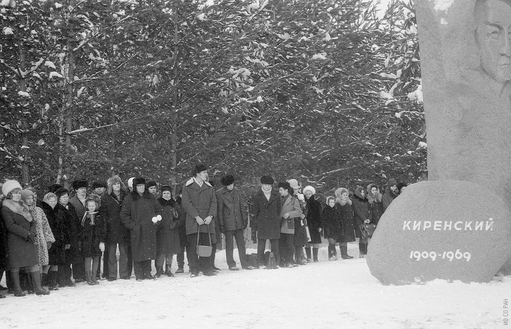 Открытие памятника на могиле академика Л.В. Киренского в Академгородке Красноярска напротив Института физики СО АН СССР, который он организовал в 1956 г., 4 ноября 1974 г.