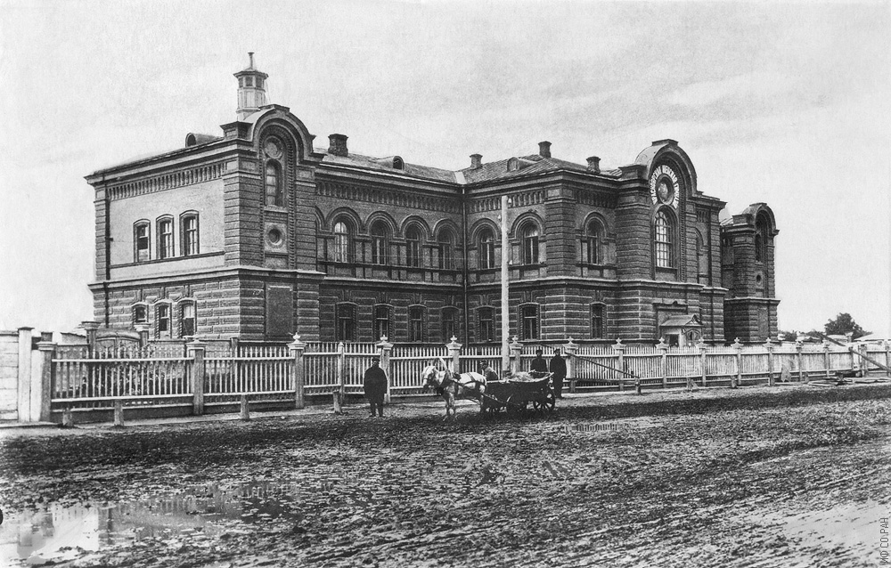 Это здание построено по проекту М.Ю. Арнольда в 1883-1885 годах. В нем располагалась женская гимназия. Впоследствии оно было передано государственному педагогическому институту, на физико-математическом факультете которого начинал работать в Красноярске Л.В. Киренский в 1940 году.