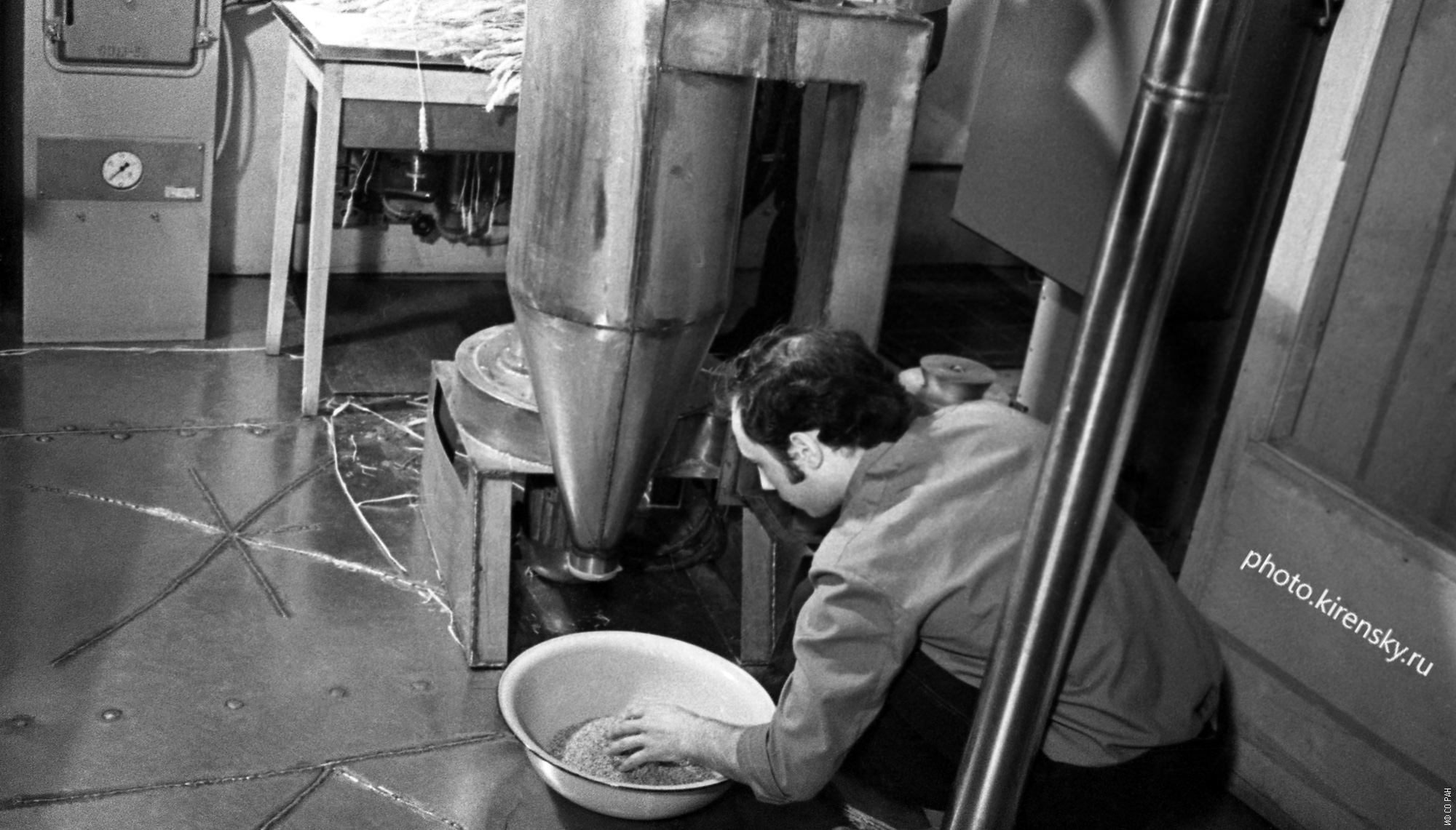 На фото запечатлен момент получение муки из зерна, выращенного во время научного эксперимента на экспериментальной установке «БИОС-3», разработанной и созданной в отделе биофизики Института физики им. Л.В. Киренского Сибирского отделения Академии наук СССР (ИФ СО АН СССР). Установка представляла замкнутую экологическую систему жизнеобеспечения с автономным управлением. Помолом муки занимается Асиньяров Г. З., сотрудник отдела биофизики института. Фото 1973 года. Красноярск.
