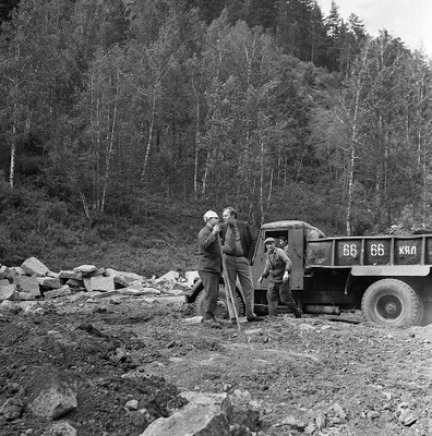 Бабаев В. А. (второй слева) выбирает в каменоломне горы Токмак гранитные плиты для дорожки к памятнику Киренского Л.В., организатора и первого директора Института физики Сибирского отделения Академии наук СССР (ИФ СО АН СССР). Академик Киренский похоронен на территории Академгородка Красноярска вблизи института его имени. Фото 1974 года.
