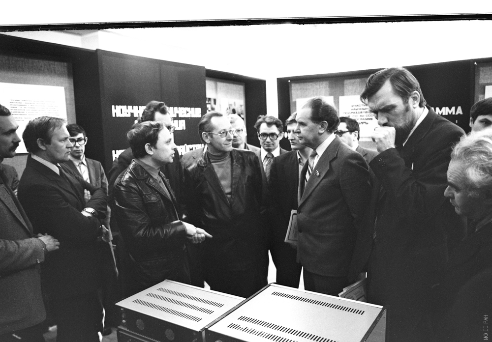На выставке «Сибирский прибор-83» в Академгородке Новосибирска. Сотрудники Института физики им. Л.В. Киренского Сибирского отделения Академии наук СССР (слева направо): Черкасов Б.И, Бабаев В.А. Москвич Ю.Н, Александров К.С., Шабанов В.Ф., Миронов В.Л., Исаев А.С. – председатель Президиума Красноярского научного центра Сибирского отделения Академии наук СССР (КНЦ СО АН СССР), Чистяков Н.С., и Кузнецкий С.С., снимок 1983 года.