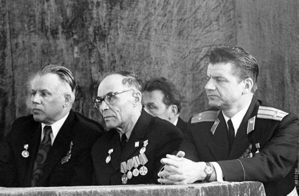 1975 год. Слева направо: Баев А.И., Коршунов А.В. и военный комиссар Октябрьского района г. Красноярска Кашинов на торжественном заседании в конференц-зале Института физики им. Л.В. Киренского Сибирского отделения Академии наук СССР, посвященном 30-летию Победы в Великой Отечественной войне (1941-1945 гг.).