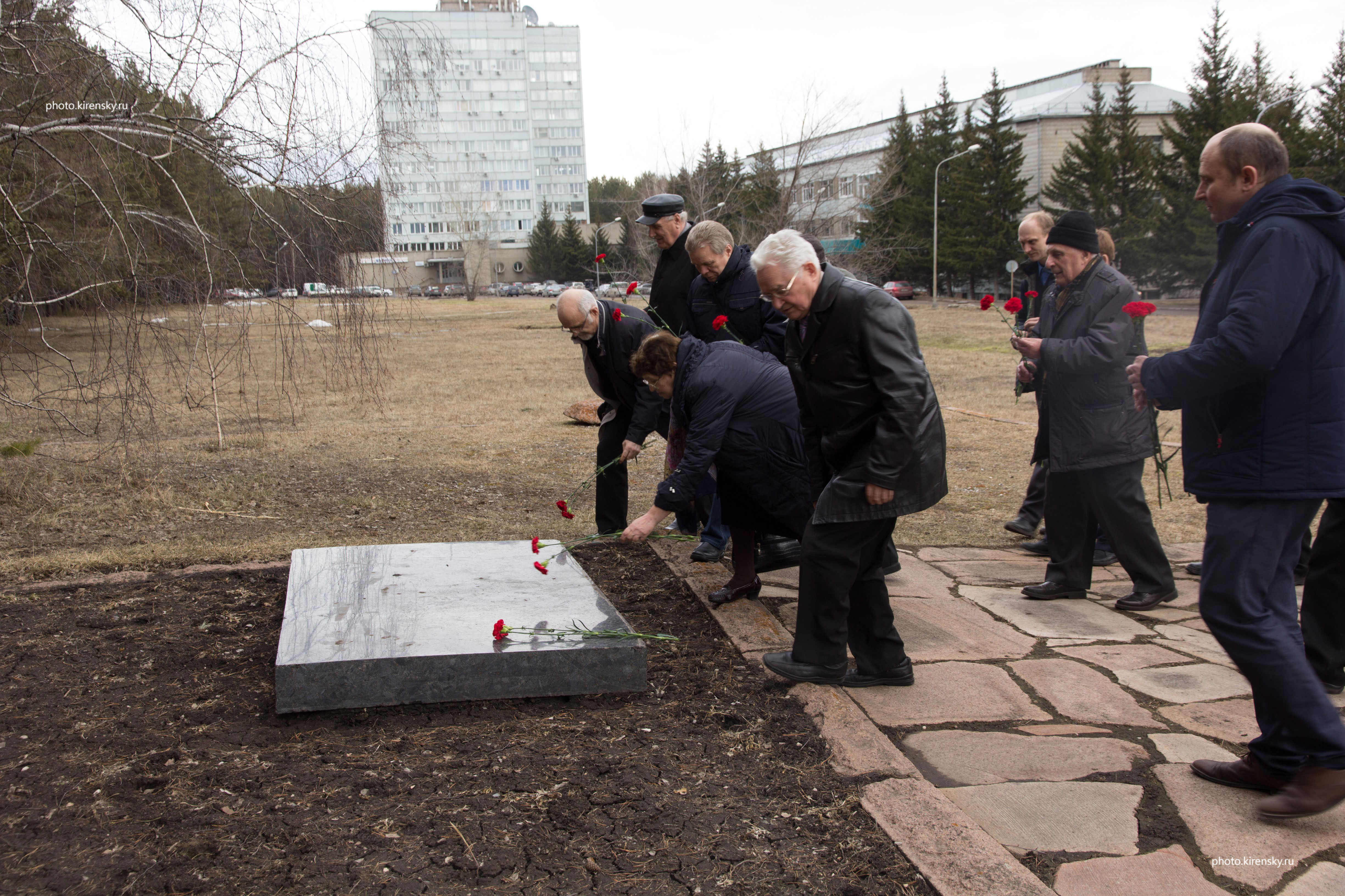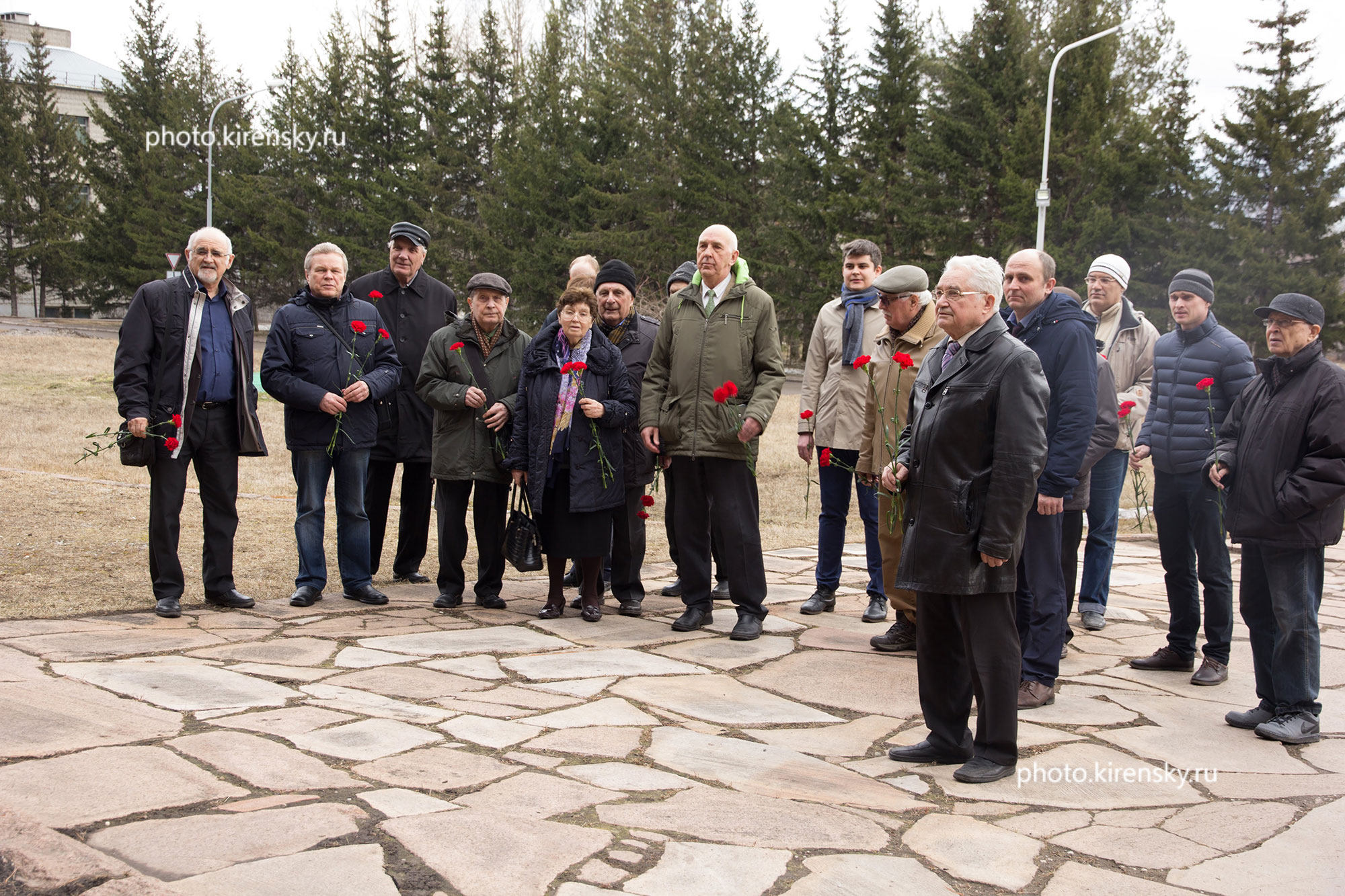 8 апреля 2018 года. Участники торжественного заседания ученого Совета Института физики им. Л.В. Киренского Сибирского отделения Российской академии наук, посвященного 109 -ой годовщине со дня рождения организатора и первого директора института академика Леонида Васильевича Киренского, возлагают цветы на его могиле в Академгородке Красноярска, где он похоронен.