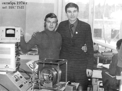 Октябрь 1974 года. Сотрудники лаборатории высокочастотных и импульсных свойств тонких магнитных пленок Института физики им. Л.В. Киренского Сибирского отделения Академии наук СССР (ИФ СО АН СССР) Беляев Б.А. (слева) и Тюрнев В.В. Красноярск.