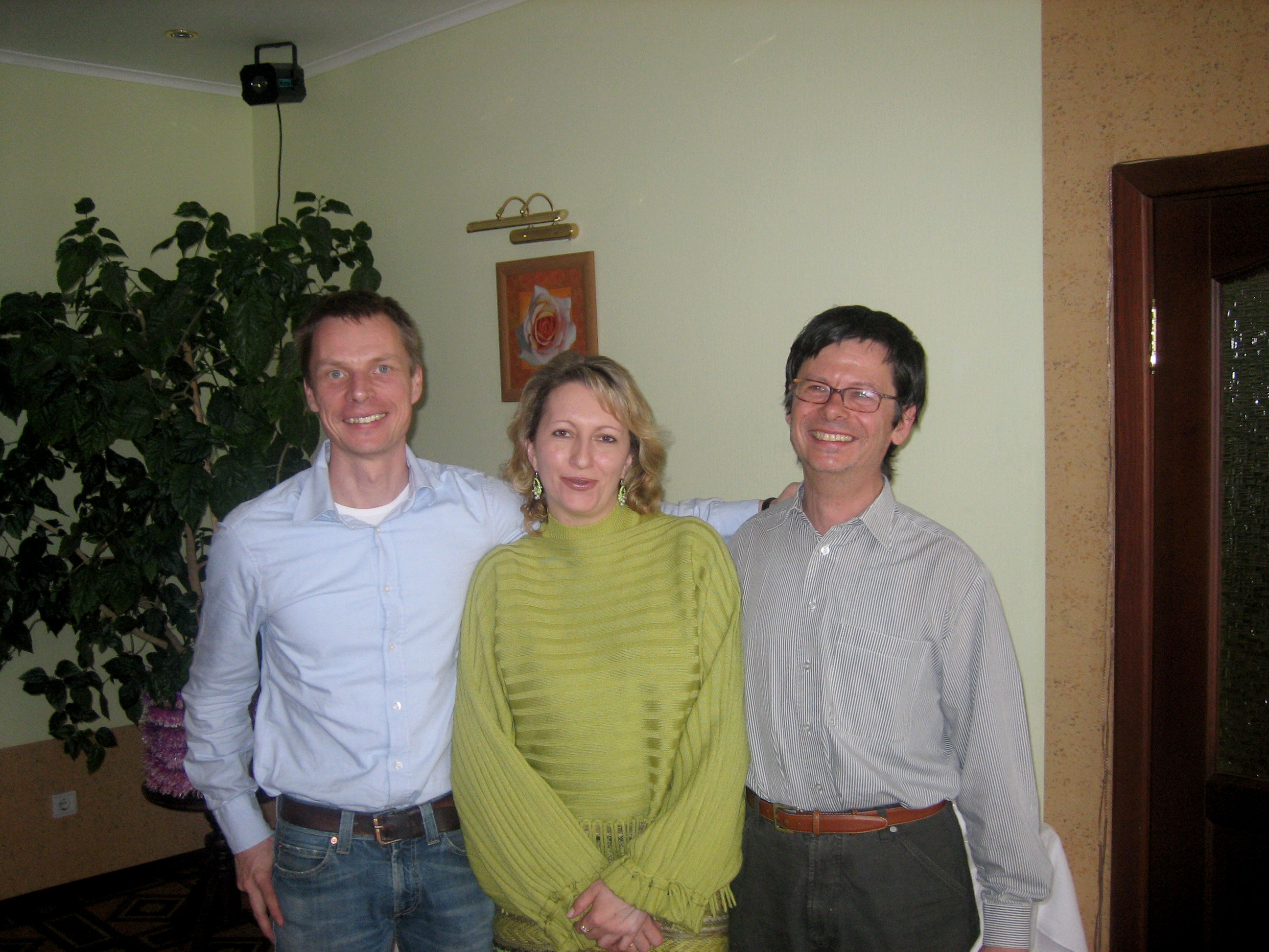 Март 2007 г. Дом учёных, INTAS Workshop. Мартин Боем (Институт Лауэ-Ланжевена, Гренобль, Франция) (слева) и Йорг Шеффер (Институт Пауля Шеррера, Виллиген, Швейцария). В центре Елена Бондарева, помощник директора Института физики им. Л.В. Киренского Сибирского отделения РАН. Красноярск Академгородок.