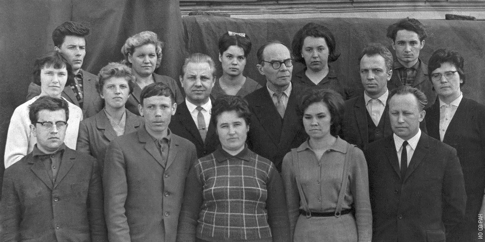 1967 год. Сотрудники лаборатории молекулярной спектроскопии Института физики Сибирского отделения Академии наук СССР (СО АН СССР с 1991 года - СО РАН). В нижнем ряду, слева направо: ?, Русецкий Ю.С., Сидорова Л.Г., Карелина Л.П., Волков В.Е. В среднем ряду, слева направо: Брандесова И.К., Аксенова Г.С., Бондерев А.Ф., Коршунов А.В., Кинд В.В., Зубанова Л.П., В верхнем ряду, слева направо: Антонов В.В., Лысяк М.В., Муражка Р.А., Тустановская Е.К., Шабанов В.Ф. Красноярск.