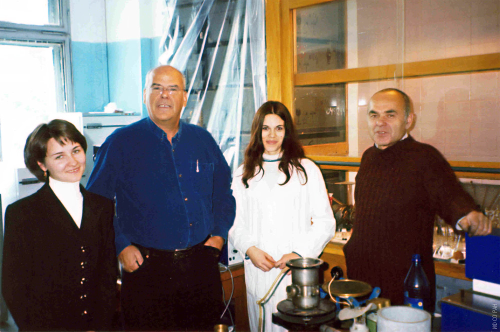 Ноябрь 2003 года. Слева направо: Булина Н.В., профессор Аарон Геданкин (Университет Бар-Илан, г. Рамат-Ган, Израиль), Грязнова С.А., Чурилов Г.Н., в лаборатории аналитических методов исследования вещества Института физики им. Л.В. Киренского Сибирского отделения Российской академии наук (ИФ СО РАН). Красноярск.