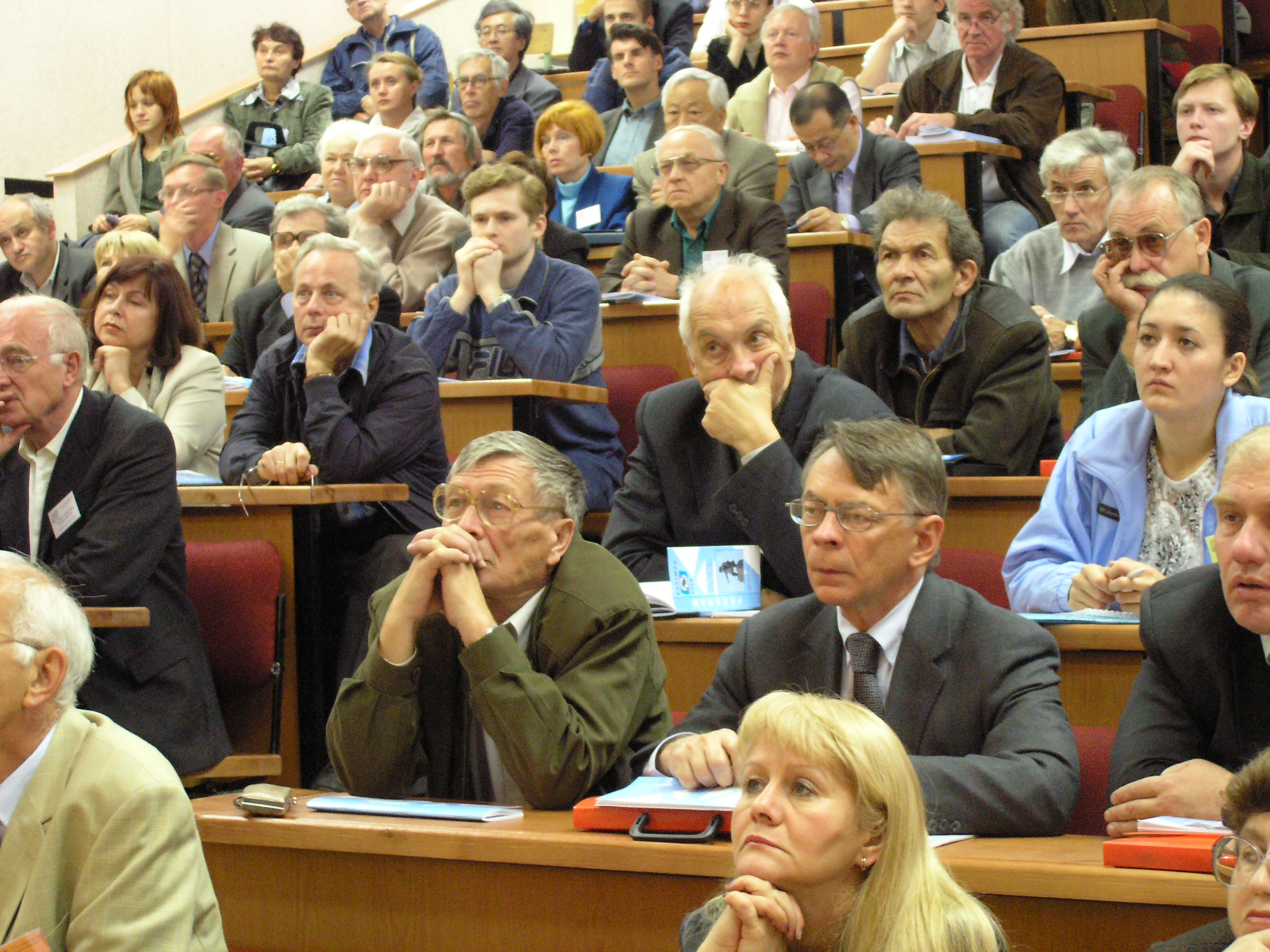 24 августа 2004 года. Участники Евро-Азиатского симпозиума «Прогресс в магнетизме» (EASTMAG-2004), организованного и проведенного в Красноярске. Пленарное заседание. Во втором ряду, слева - Зиненко В.И., ведущий научный сотрудник лаборатории кристаллофизики Института физики им. Л.В. Киренского Сибирского отделения Российской академии наук (ИФ СО РАН), в третьем ряду, справа Шнейдер Е.И., старший научный сотрудник лаборатории физики магнитных явлений ИФ СО РАН, в четвертом ряду, слева - Баюков О.А., ведущий научный сотрудник лаборатории резонансных свойств магнитоупорядоченных веществ ИФ СО РАН.