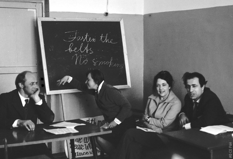 Слева направо: Смолин Р.П., Садовская Г.М., Александрова И.П., Фиш А.М, сотрудники Института физики им. Л.В. Киренского Сибирского отделения Академии наук СССР (ИФ СО АН СССР), на занятиях в группе по ускоренному изучению английского языка (кафедра иностранных языков), фото 1976 года. Красноярск.