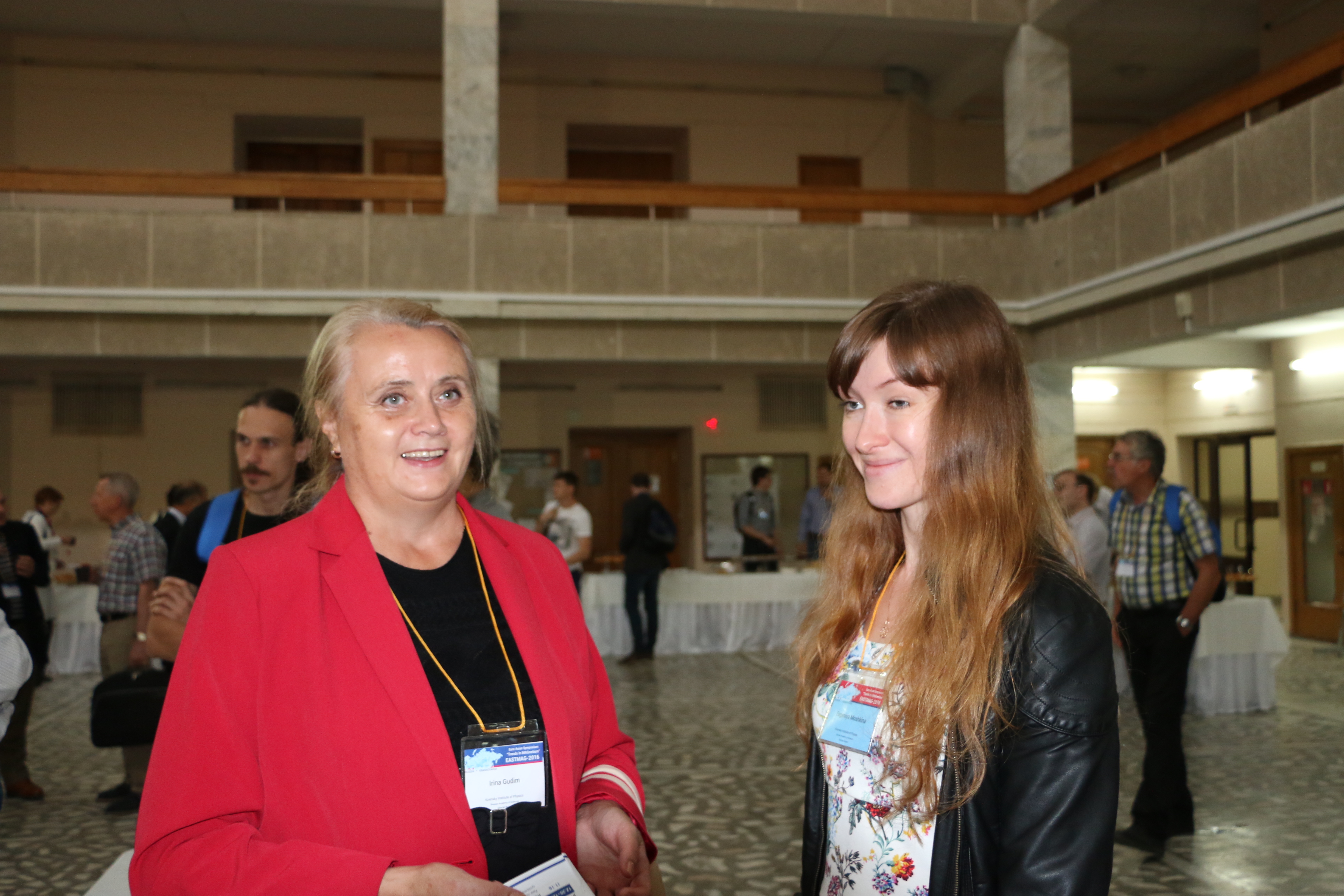 Ирина Анатольевна Гудим, старший научный сотрудник (слева) и Евгения Михайловна Мошкина, научный сотрудник лаборатории радиоспектроскопии и спиновой электроники Института физики им. Л.В. Киренского Сибирского отделения Российской академии наук (ИФ СО РАН), участники Евро-Азиатского симпозиума "Прогресс в магнетизме" (EASTMAG-2016), организованного и проведенного в Красноярске в августе 2016 года. Симпозиум проводился в конгресс-холле Сибирского федерального университета (СФУ).