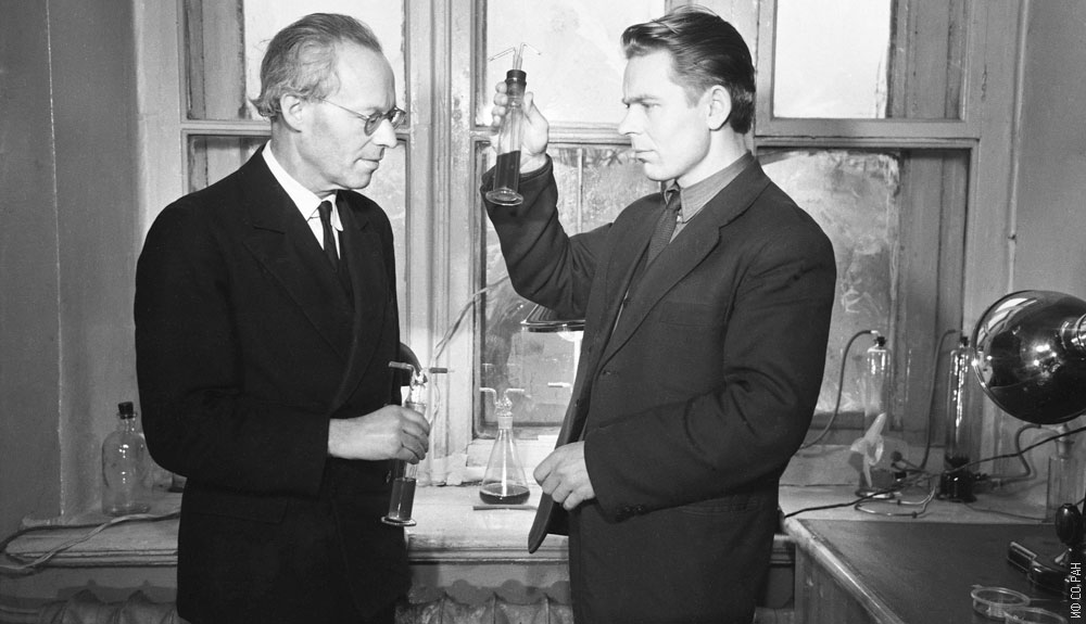 Гуревич А. А. (слева) и Трубачев И. Н., руководитель группы биохимии в лаборатории биофизики Института физики Сибирского отделения Академии наук СССР (ИФ СО АН СССР), фото 1967 г.