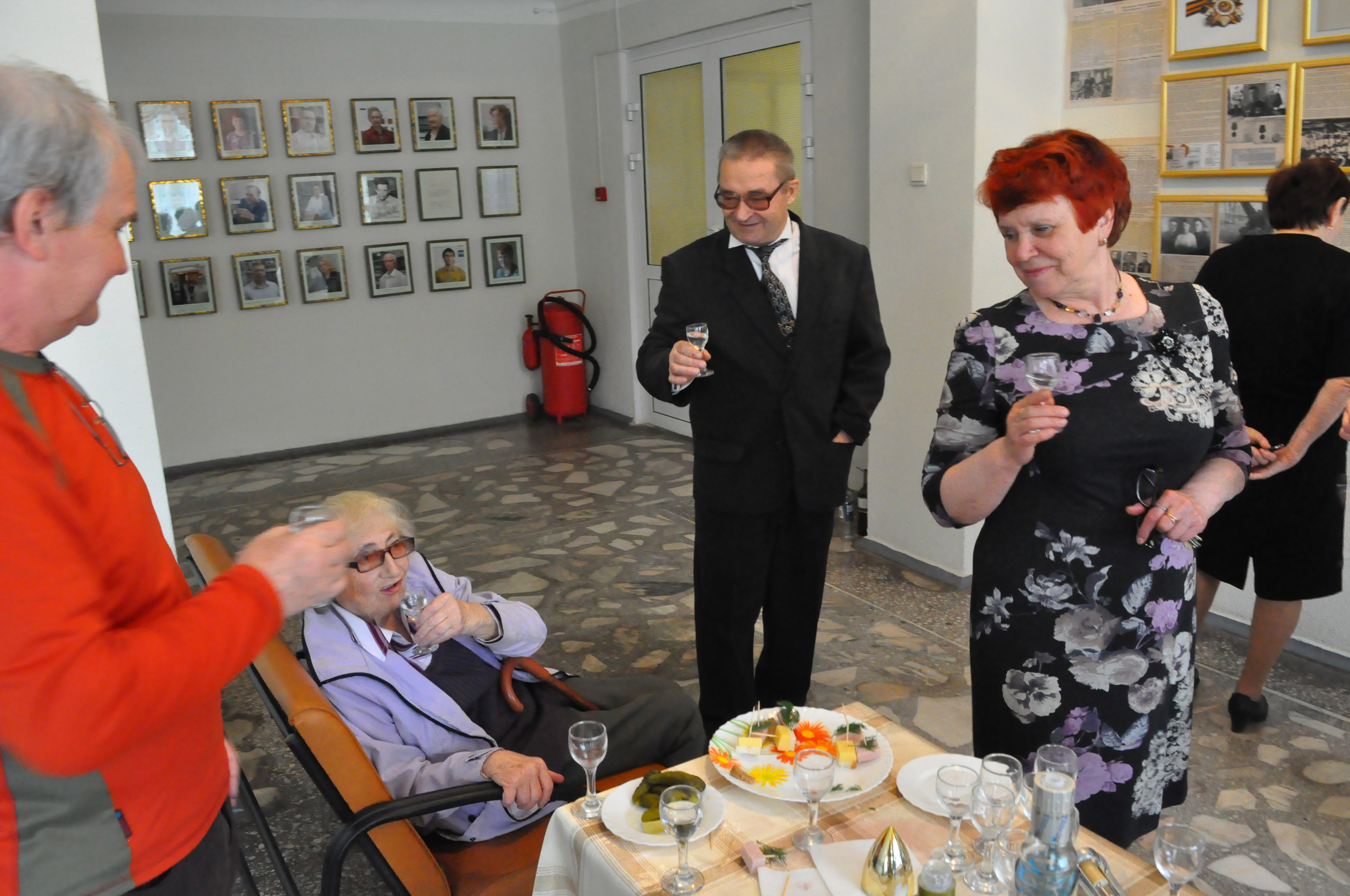 8 мая 2015 года. На открытии стенда «Живем и помним…» в холле Института физики им. Л.В. Киренского Сибирского отделения Российской академии наук (ИФ СО РАН), посвященного родителям и родственникам сотрудников института - воинам Великой Отечественной войны 1941-1945 гг. Слева направо: Заблуда В.Н., Саблина К.А. , Воронов В.Н., Кармацкая Е.Д. Тост за Победу. Красноярск.