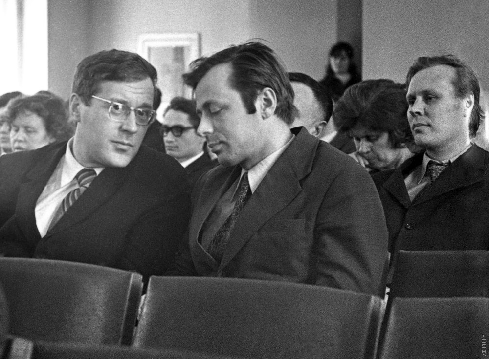 На физическом семинаре в конференц-зале Института физики им. Л.В. Киренского Сибирского отделения Академии наук СССР (ИФ СО АН СССР). В первом ряду: Кашкин В.Б. (слева) и Петраковский Г.А., за ним Хрусталев Б.П. Снимок 1974 года. Красноярск.