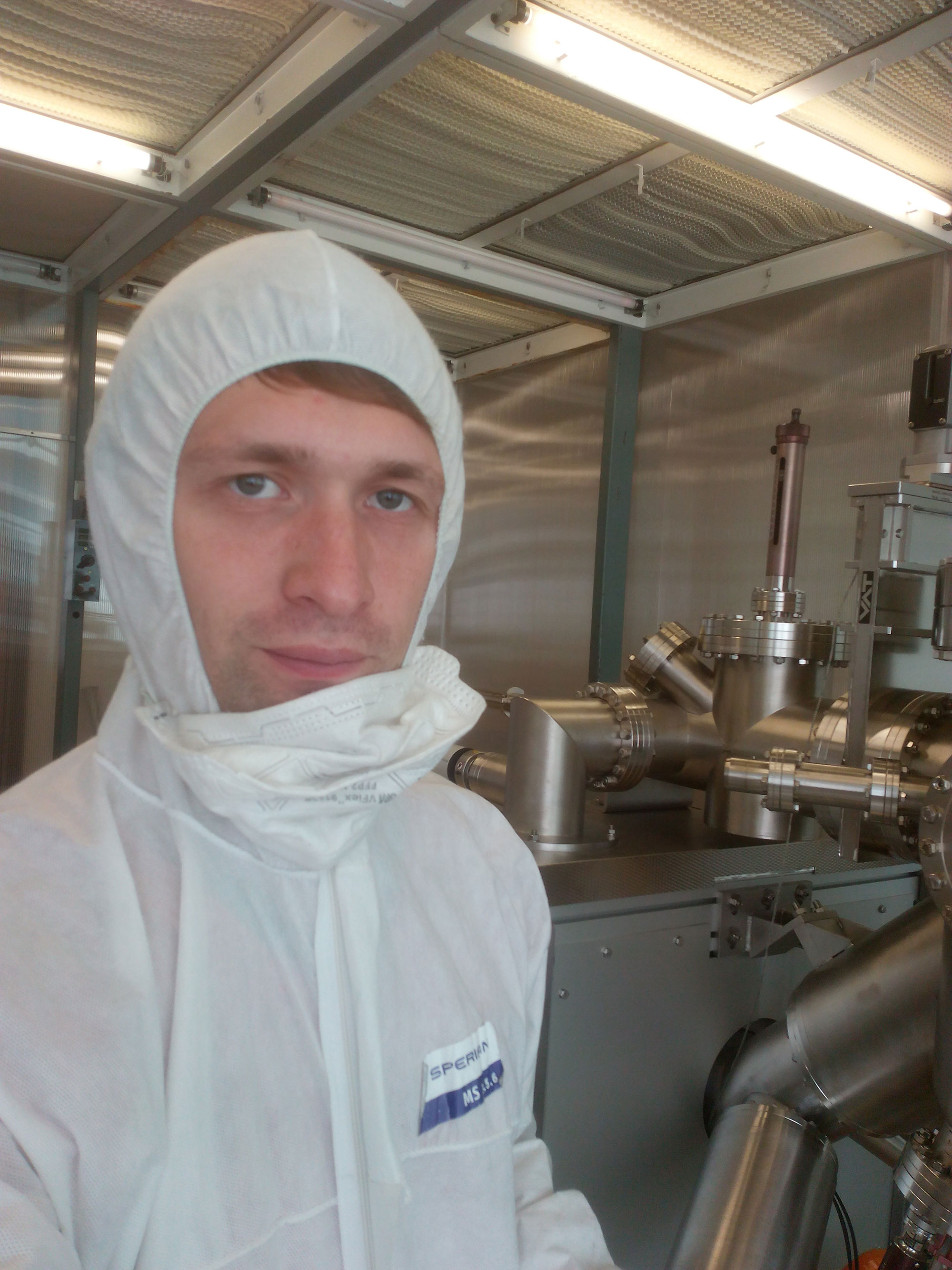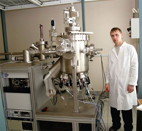 Кобяков Александр Васильевич, кандидат физико-математических наук, научный сотрудник лаборатории магнитодинамики Институте физики им. Л.В. Киренского Сибирского отделения Российской академии наук (ИФ СО РАН). Снимок сделан у сверхвысоковакуумной установки магнитного напыления с тремя мишенями в 2011 году. Установка эксплуатируется в научно-образовательном центре «Наноразмерные и перспективные материалы и нанотехнологии» Институтом физики и Сибирским федеральным университетом.