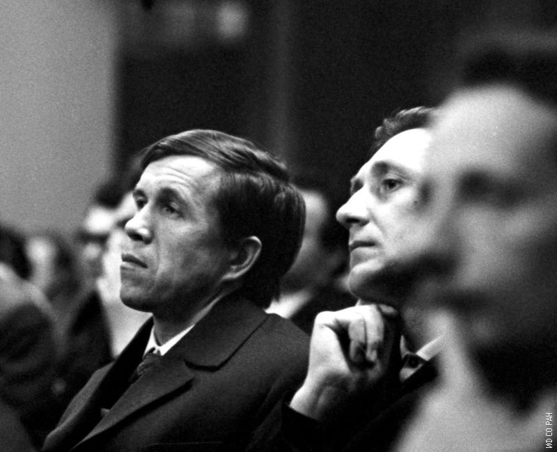 Кочаров Н. Г. (слева) и Трубачев И. Н., сотрудники Института физики им. Л.В. Киренского Сибирского отделения Академии наук СССР (ИФ СО АН СССР), в актовом зале Красноярского научного центра СО АН СССР на собрании, посвященном 250-летию образования Академии наук СССР, фото 1975 года.
