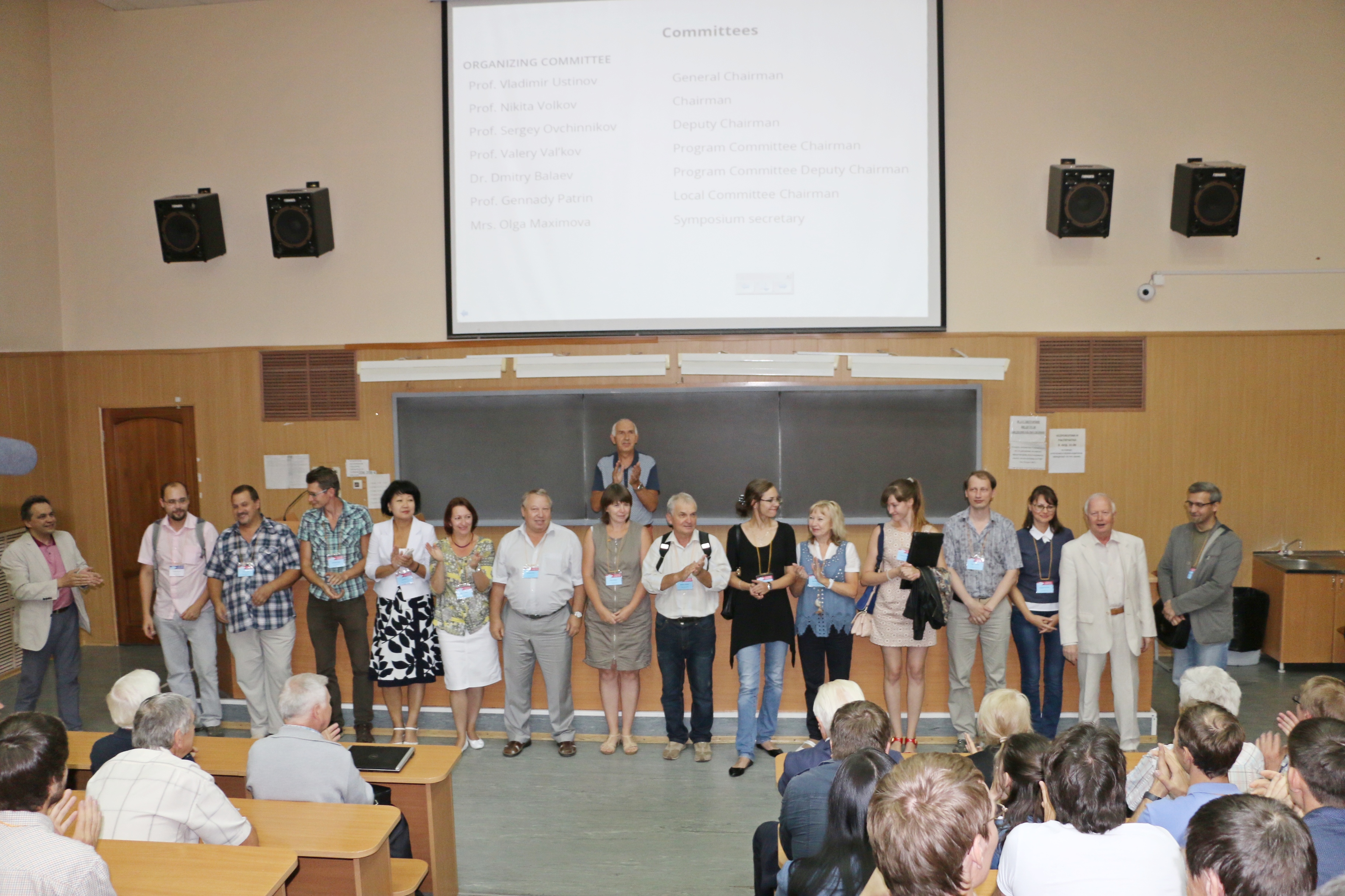 Аплодисменты членам локального Организационного комитета Евро-Азиатского симпозиума "Прогресс в магнетизме" (EASTMAG-2016) - сотрудникам Института физики им. Л.В. Киренского Сибирского отделения Российской академии наук (ИФ СО РАН). На снимке, слева направо: Никита Валентинович Волков, председатель Организационного комитета симпозиума, Дмитрий Петров, Алексей Соколов, Ярослав Шиян, Людмила Ли, Елена Бондарева, Геннадий Семёнович Патрин, председатель локального Организационного комитета симпозиума, Оксана Иванова, Владимир Заблуда, Наталья Гребенникова, Ольга Бруштунова, Евгения Мошкина, Сергей Николаев, Евгения Шуваева, Валерий Владимирович Вальков, Сергей Комогорцев. Красноярск.