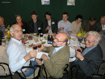 На снимке: сидят родители Максима Михайловича Коршунова, мама -Нина Дмитриевна Коршунова, инженер лаборатории сверхсильных магнитных полей и папа Михаил Анатольевич Коршунов, кандидат физико-математических наук, старший научный сотрудник лаборатории молекулярной спектроскопии Института физики им. Л.В. Киренского Сибирского отделения Российской академии наук (ИФ СО РАН). Стоят, слева направо: Валерий Владимирович Вальков, заведующий теоретическим отделом ИФ, Максим Коршунов, Сергей Геннадьевич Овчинников, заместитель директора института и заведующий лабораторией физики магнитных явлений. Фото после защиты Коршуновым кандидатской диссертации в 2004 году.