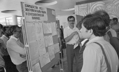 Петроковский Герман Антонович (слева), заведующий лабраторией резонансных свойств магнитоупорядоченных веществ и Красиков Владимир Сергеевич, научный сотрудник лаборатории кристаллофизики Института физики им. Л.В. Киренского Сибирского отделения Академии наук СССР (ИФ СО АН СССР), у стендовых докладов на конференции по функциональной магниоэлектронике в Дивногорске (Красноярский край) в 1986 году.