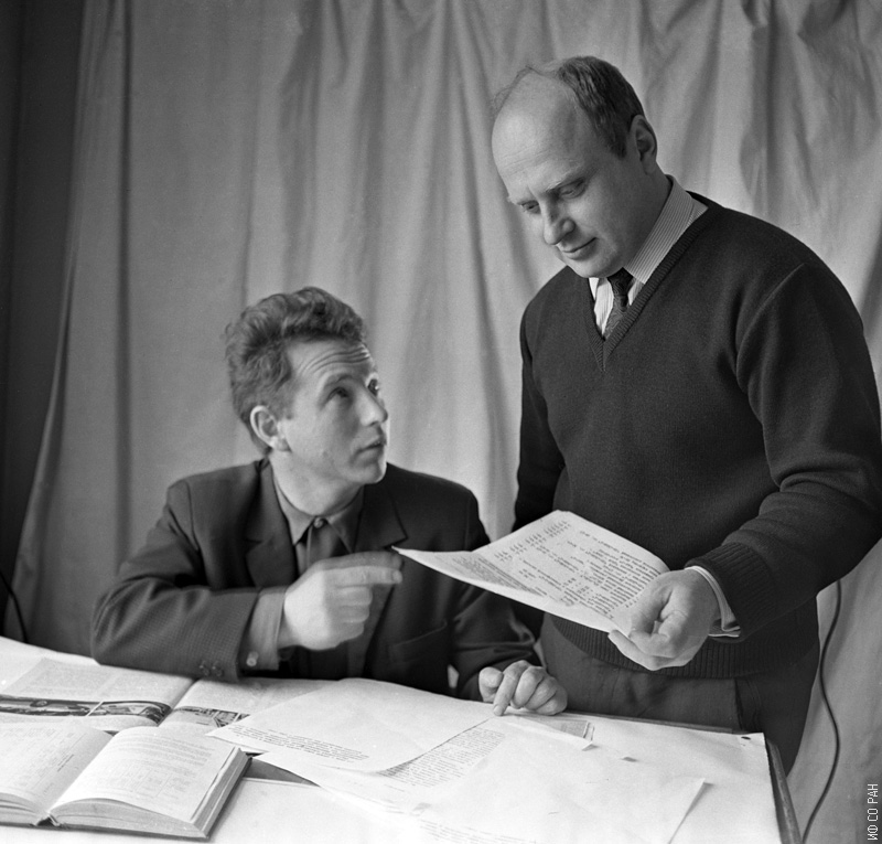 Шапиро В. Е. (слева) и Куденко Ю. А., сотрудники теоретического отдела Института физики им. Л.В. Киренского Сибирского отделения Академии наук СССР, за обсуждением научных результатов. Снимок 1971 года. Красноярск.