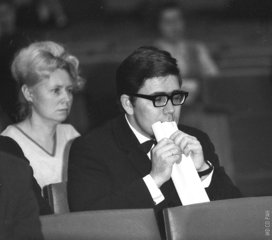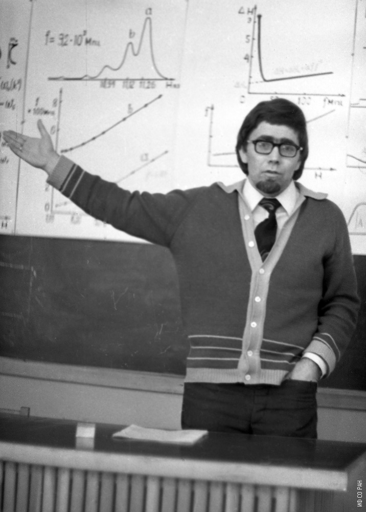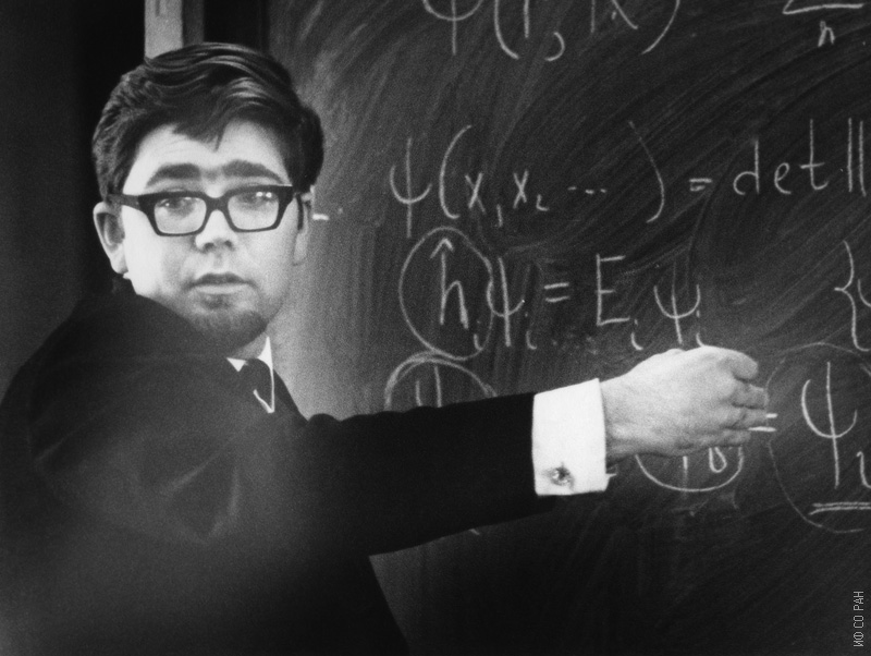 Кузьмин Е.В., старший научный сотрудник теоретического отдела Института физики им. Л.В. Киренского Сибирского отделения Академии наук СССР (ИФ СО АН СССР), на семинаре отдела. Фото 1974 года. Красноярск.
