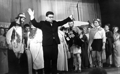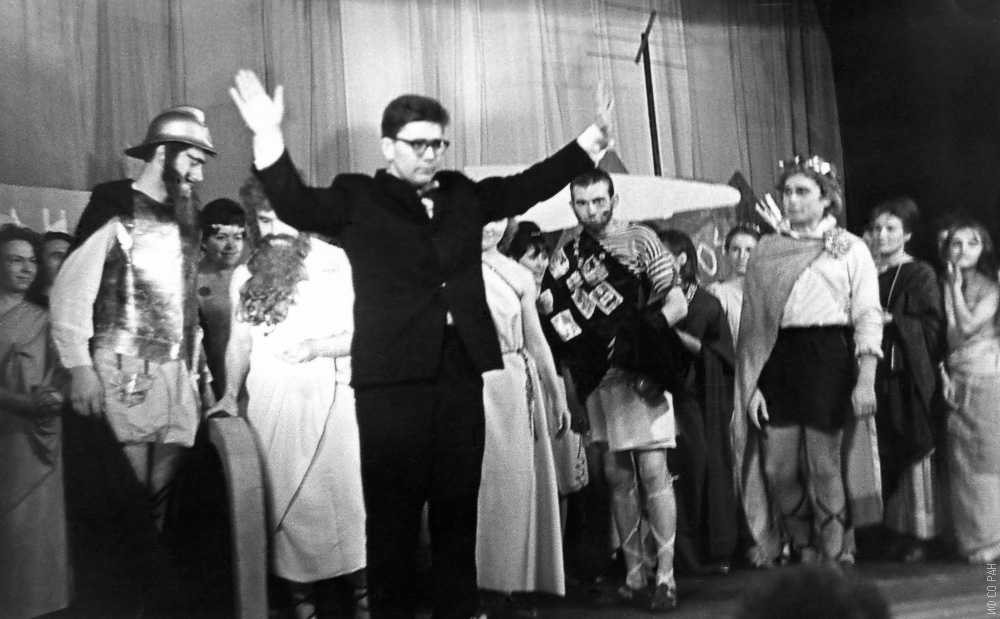 В Институте физики им. Л.В. Киренского Сибирского отделения Российской академии наук (ИФ СО РАН) остались яркие воспоминания о том, как один из первых сотрудников теоретического отдела института Е. В. Кузьмин в 1966 году поставил оперу "Архимед" с прекрасным изложением основ атомной физики в ариях, дуэтах и хоровом исполнении. Режиссеру и исполнителю главной роли Кузьмину доводилось в студенчестве (он выпускник МГУ) выступать в аналогичном спектакле на сценах Московского университета, Курчатовского института, в Московском доме литераторов. На концертах, в разное время, присутствовали Нильс Бор, Лев Давыдович Ландау, Константин Симонов, и везде выступления студентов пользовались огромным успехом. Опера, в красноярской трактовке, не раз исполнялась со сцены Дома учителя, в институтах и на научных конференциях Красноярска. В хоре пели сотрудники института и студенты Красноярского филиала Новосибирского университета в Красноярске. Снимок 1966 года.