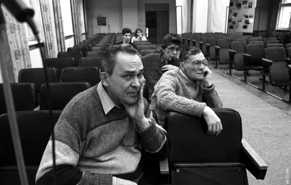 Михаил Иванович Петров (в первом ряду), Виктор Иванович Зиненко (во втором ряду) и Евгений Всеволодович Кузьмин (в третьем ряду), сотрудники Института физики им. Л.В. Киренского Сибирского отделения Российской академии наук, в перерыве семинара в конференц-зале института. Фото 1998 года. Красноярск.