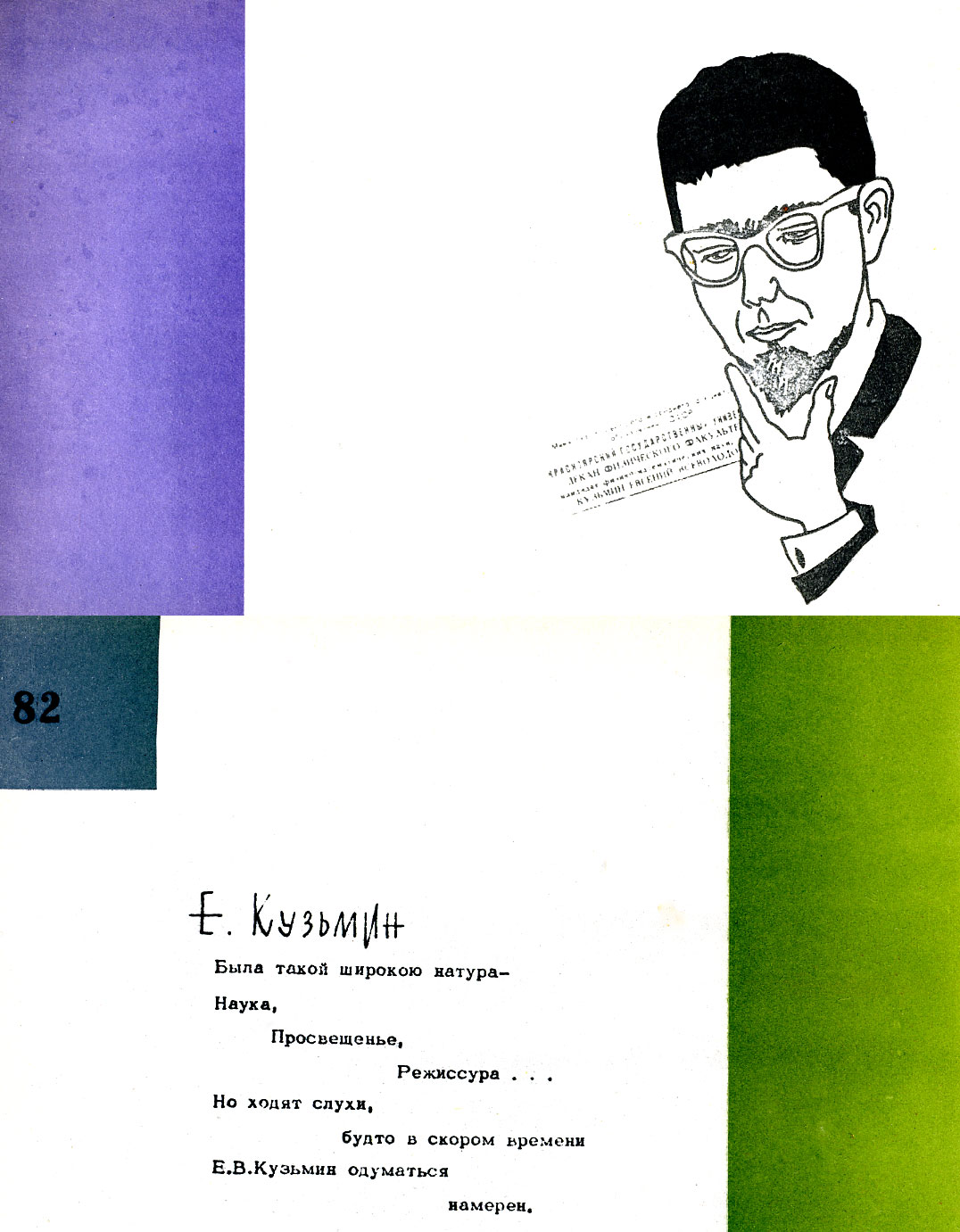 Дружеский шарж Кузьмина Е.В. из книги "Музей друзей", изданной научными сотрудниками Института физики Сибирского отделения Академии наук СССР Олегом Артемьевичем Баюковым и Николаем Сергеевичем Чистяковым. Удивительная книжка дружеских шаржей и эпиграмм на сотрудников. Она вышла в 1967 году к 10-летию начала работы института. Вышла небольшим тиражом в 100 экземпляров и распространялась строго по списку, лично в руки. Узнать себя на страницах книги смогли 48 самых ярких и заметных личностей молодого института. Позже (в 1971 году) вышла вторая книга под таким же названием. Что побудило их взяться за такой труд, авторы подробно изложили в предисловии к первой и второй книгам. Книги размещены на сайте. Красноярск.