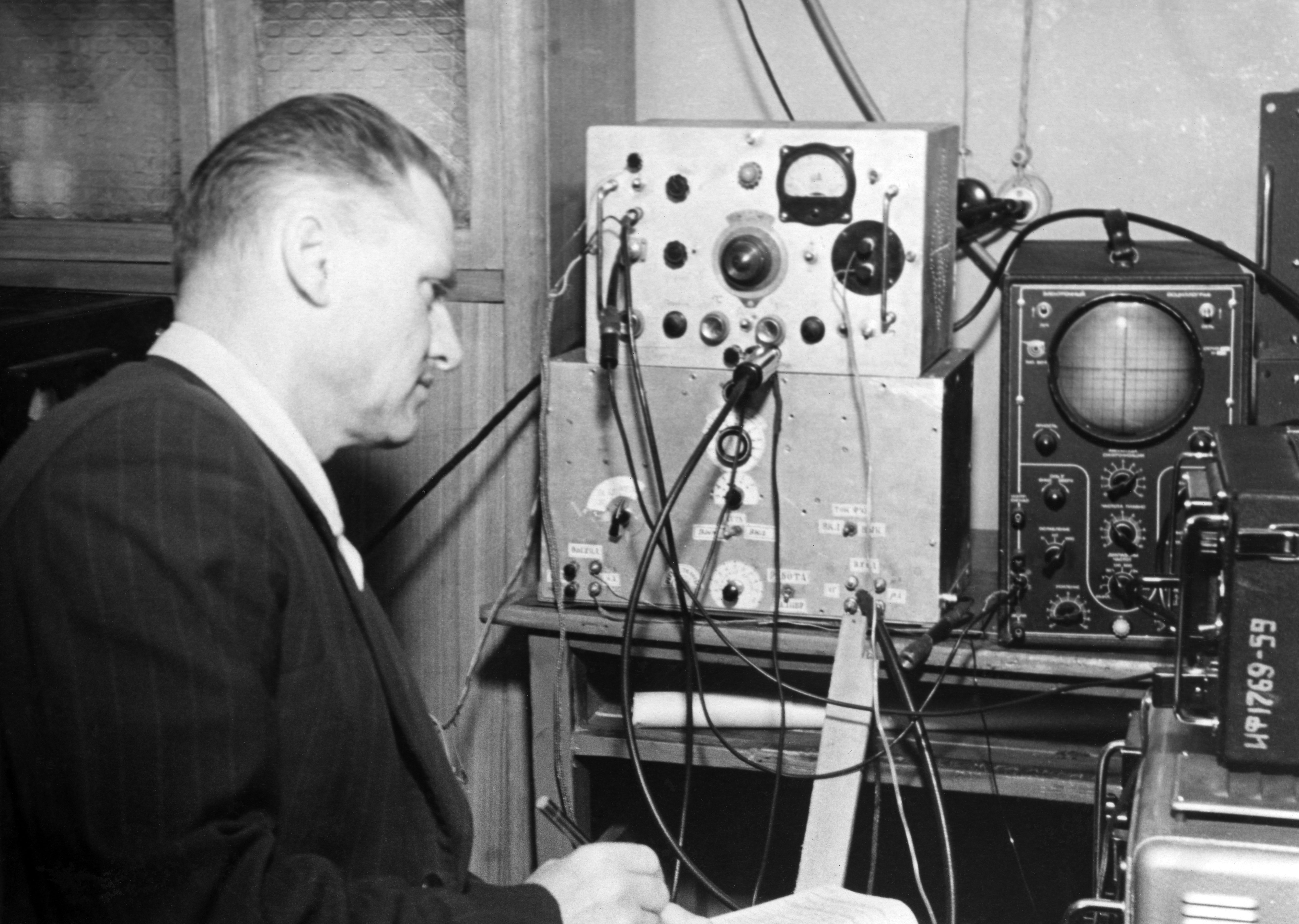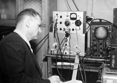 Кузнецов Виктор Ефремович, первый ученый секретарь Института физики Сибирского отделения Академии наук СССР (ИФ СО АН СССР), у установки по исследованию дифференциальной магнитострикции в динамических режимах. Фото 1962 года. Красноярск.
