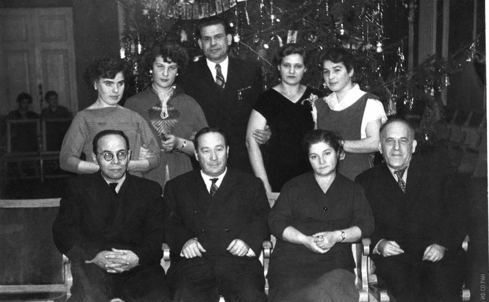 Встреча Нового 1964 года сотрудниками Института физики Сибирского отделения Академии наук СССР (ИФ СО АН СССР). Сидят (слева направо): Коршунов Анатолий Васильевич, заведующий лабораторией молекулярной спектроскопии, Киренский Леонид Васильевич, директор института, супруга Киренского Зоя Яковлевна, Ливенсон Михаил Соломонович, заведующий лабораторией химии. Красноярск.