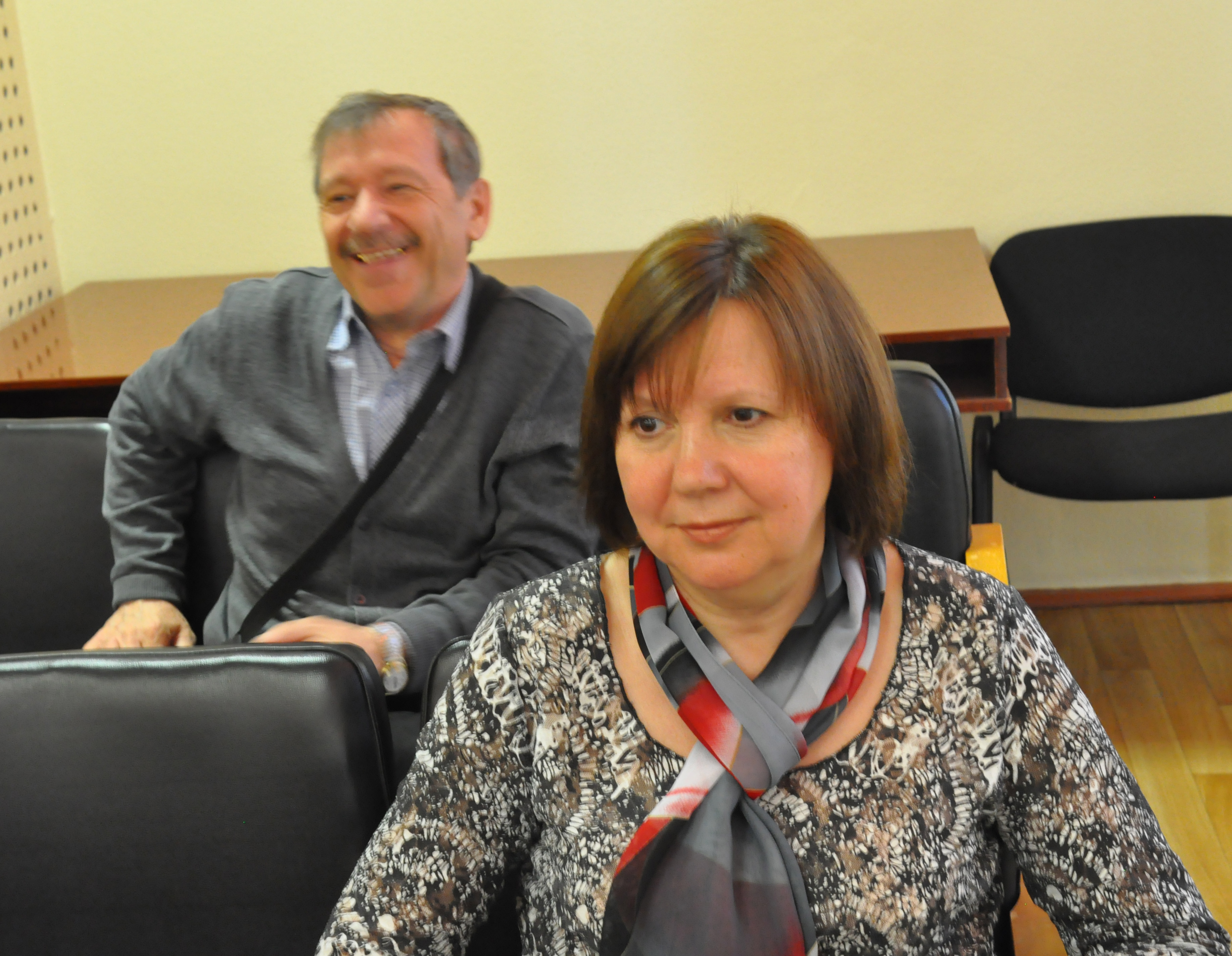 2015 год, 8 мая. И.П. Лукина и В.А. Гуняков, сотрудники Института физики им. Л.В. Киренского Российской академии наук (ИФ СО РАН), в конференц-зале института на концерте, посвященном 70-тию Победы в Великой Отечественной войне (1941-1945 гг.). Красноярск. Академгородок.