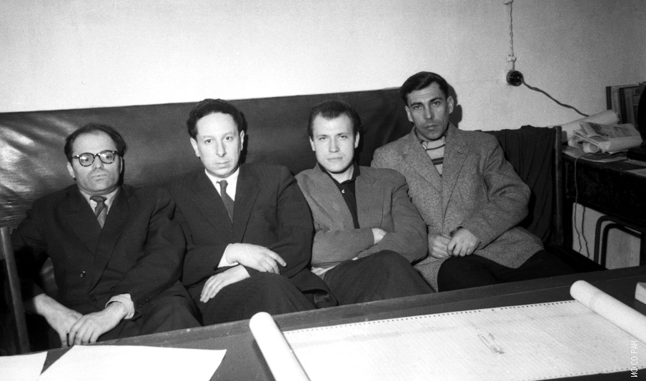 1974 год 7апреля. Ежегодные научные чтения, посвященные памяти Леонида Васильевича Киренского на заседании ученого совета Института физики его имени Сибирского отделения Академии наук СССР. Слева направо: Анистратов Анатолий Тихонович, Айзенберг Лев Абрамович, Дрокин Александр Иванович, Лундин Арнольд Геннадьевич.