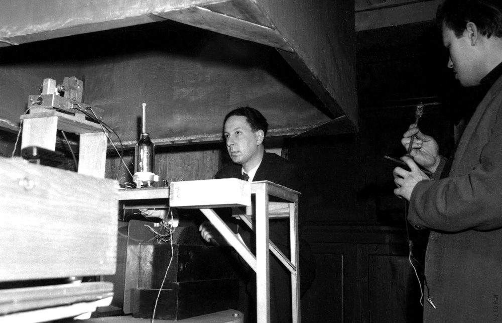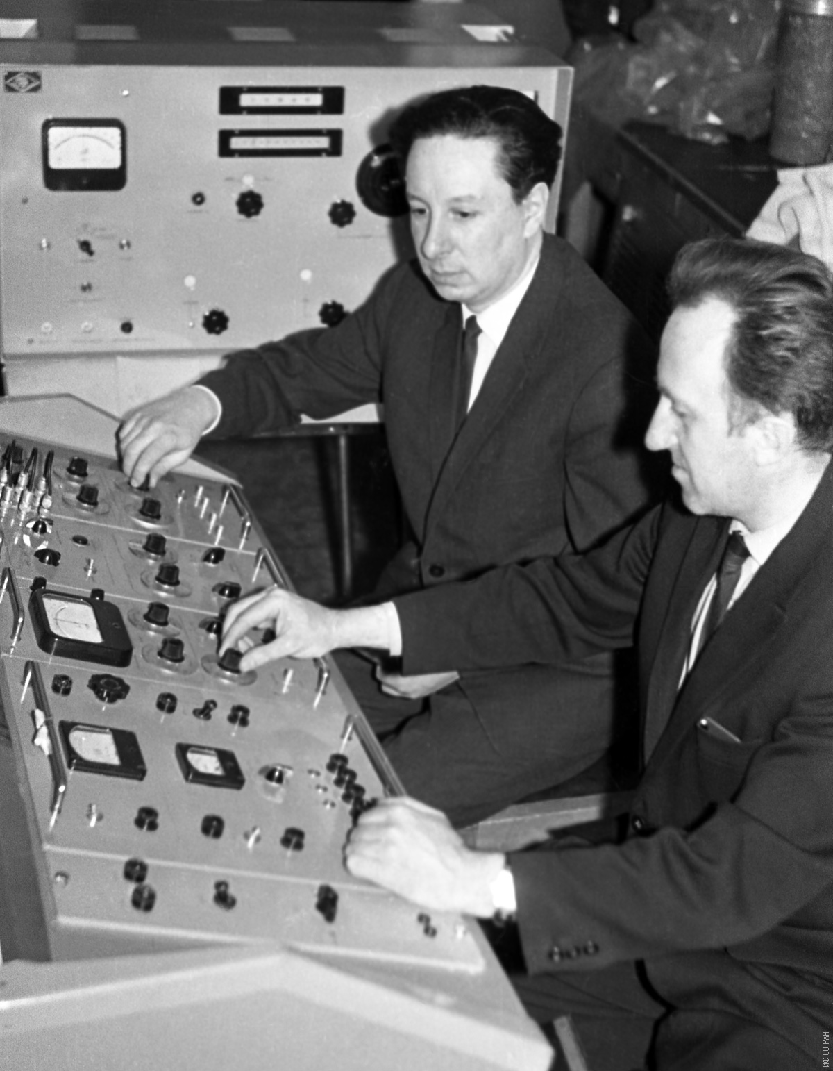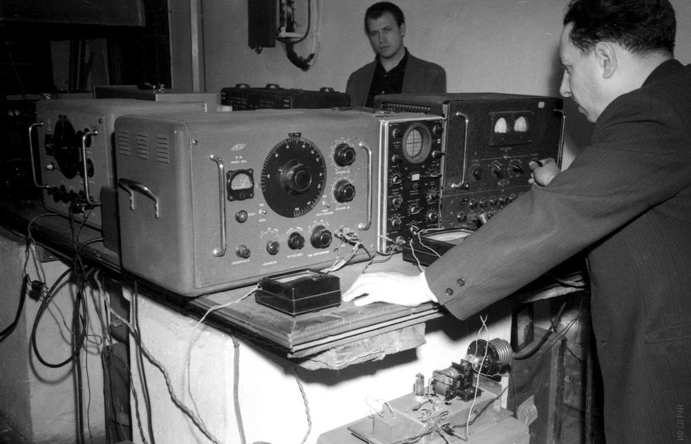 Лундин А.Г. (слева) и Гуревич А.С., сотрудники Института физики Сибирского отделения Академии наук СССР (ИФ СО АН СССР), за работой на импульсном квадрупольном спектрометре, снимок 1967 года. Красноярск