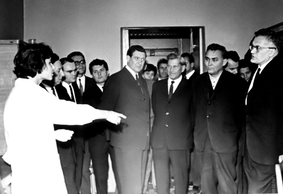 Руководители края знакомятся с работой отдела биофизики Института физики им. Л.В. Киренского Сибирского отделения Академии наук СССР. В центре первый секретарь Красноярского краевого комитета КПСС В.И. Долгих, пояснения дает Р.И. Чумакова, фото 1980 года. Красноярск, Академгородок.