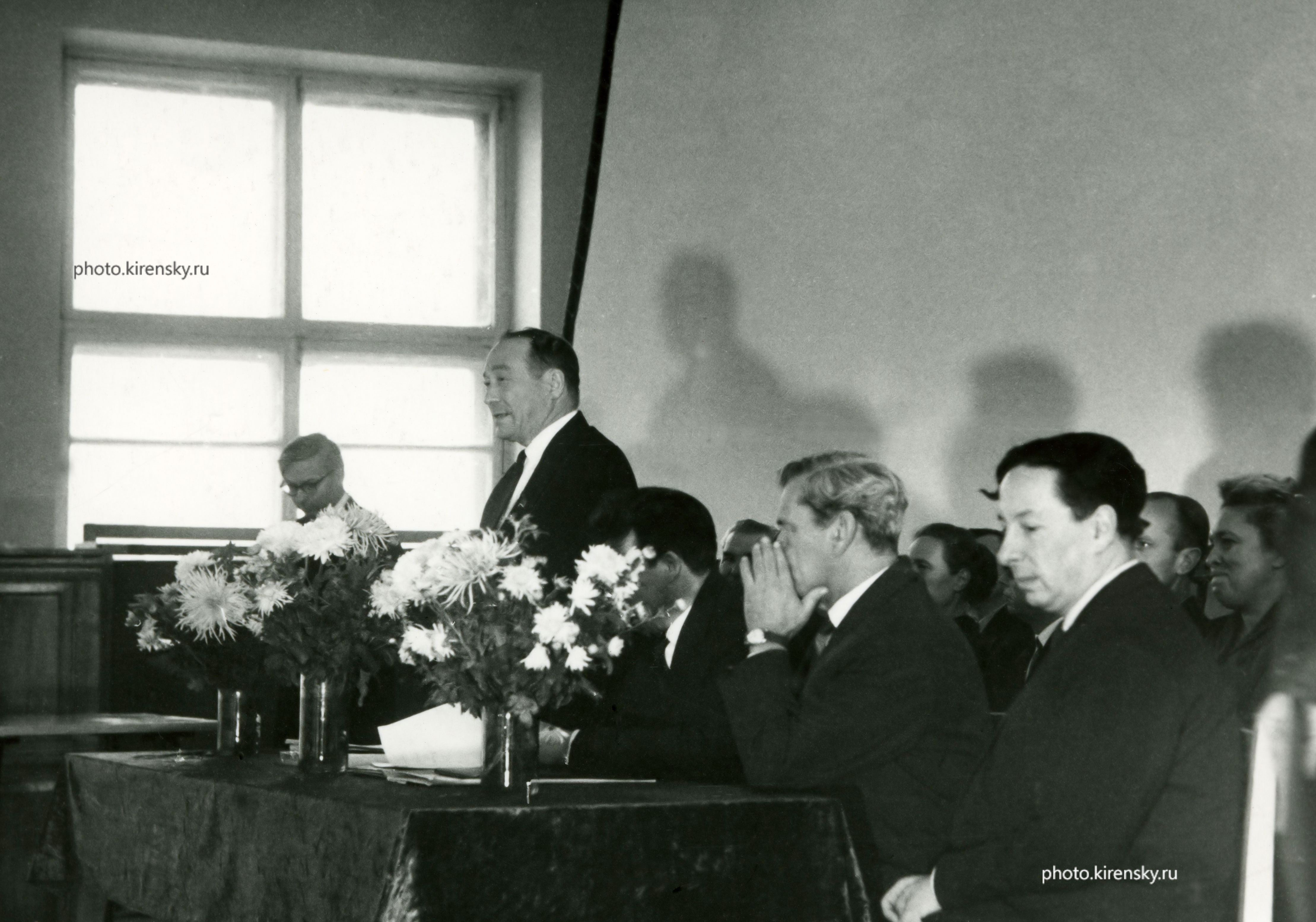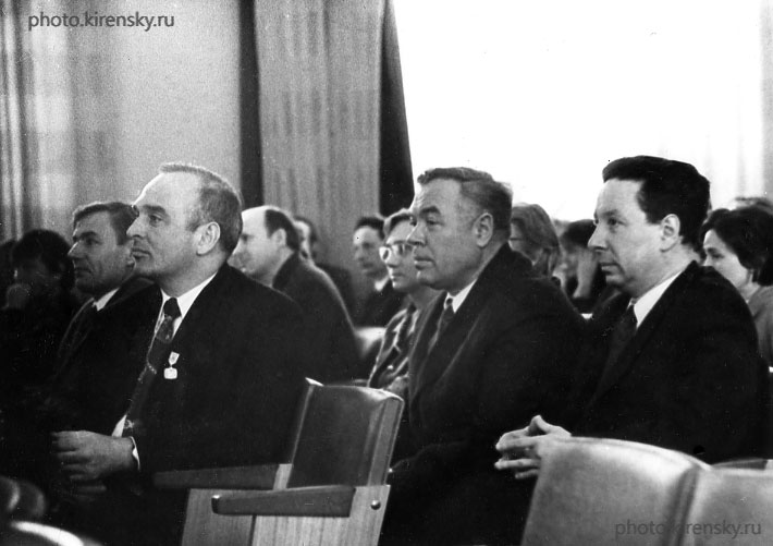7 апреля1969 года. Академику Л.В. Киренскому, директору Института физики Сибирского отделения Академии наук СССР (ИФ СО АН СССР) исполнилось 60 лет. В конференц-зале института поздравляли юбиляра. В президиуме торжественного заседания, слева направо: Сидько Ф.Я., Киренский Л.В., Калинин В.В., Сарапкин П.С., Лундин А.Г. Красноярск.