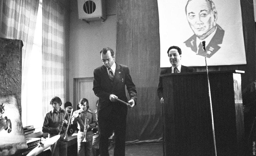 На торжественном заседании, посвященном 25-летию образования Института физики Сибирского отделения Академии наук СССР, заместитель директора по научной работе Арнольд Геннадьевич Лундин (за кафедрой) вручает грамоту Академии наук СССР Борису Григорьевичу Коврову. На заднем плане музыкальный ансамбль, организованный сотрудниками института под руководством Бориса Афанасьевича Беляева, фото 1981 года. Красноярск.