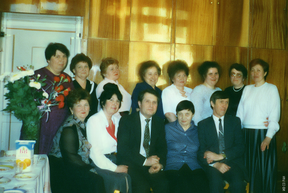 2002 год. Фото на память в день юбилея Марии Ильиничны Шушкевич. Мария Ильинична долгие годы проработала главным бухгалтером в Институте физики им. Л.В. Киренского Сибирского отделения Российской академии наук. Сидят (слева направо): Ливченко Н.Е., Лоскутова Э.Ф., Захаров Ю.В., Шушкевич М.И., Агапов А.В. Стоят (слева направо): Будюкина Н.П., Юсина Л.Ф., Макарова А.П., Галямина З.Я., Хаванская В.С., Круглова В.М., Командина Г.В., Матыгулина М.М. Красноярск.