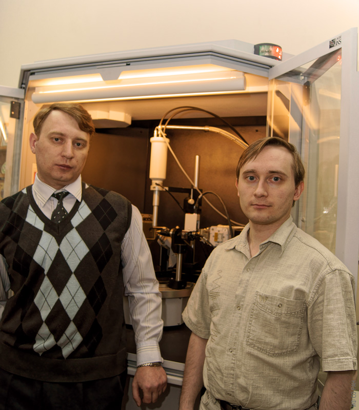 Виталий Сергеевич Бондарев (слева), научный сотрудник лаборатории кристаллофизики, специалист в области физики конденсированного состояния вещества, Максим Сергеевич Молокеев, старший научный сотрудник лаборатории кристаллофизики, специалист в области рентгеноструктурного анализа Института физики им. Л.В. Киренского Сибирского отделения Российской академии наук (ИФ СО РАН), фото 2011 года. Красноярск.
