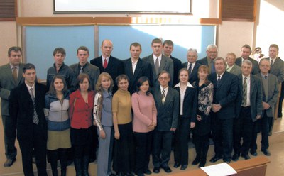 Февраль 2004 года. Александров К.С. (крайний справа в первом ряду), Шабанов В.Ф. (пятый справа во втором ряду) среди преподавателей и выпускников Межвузовского инженерно-физического отделения (МИФО) Красноярского государственного университета. Красноярск.