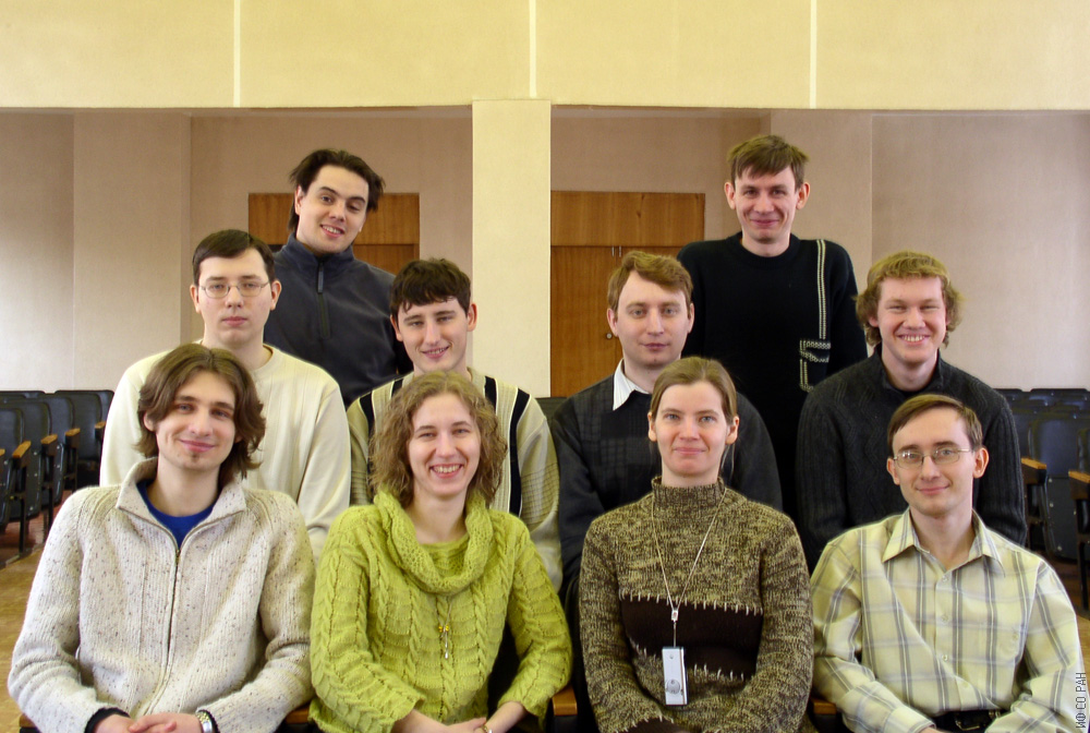 Молодое поколение сотрудников лаборатории кристаллофизики Института физики им. Л.В. Киренского Сибирского отделения Российской академии наук. В первом ряду (слева направо): Павловский М.С., Фокина В.Д., Софронова С.Н., Молокеев М.С. Во втором ряду (слева направо): Жандун В.С., Погорельцев Е.И. , Бондарев В.С., Богданов Е.В. . В третьем ряду (слева направо): Бойко Ю.В., Карташев А.В., фото 2006 года. Красноярск.
