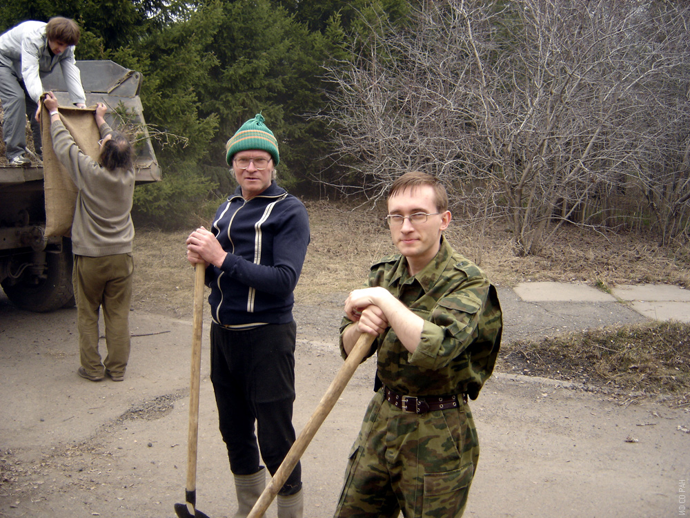 Традиционный весенний субботник по уборке территории института. На переднем плане сотрудники лаборатории кристаллофизики Института физики им. Л.В. Киренского Сибирского отделения Российской академии наук (ИФ СО РАН) Сысоев А.М. (слева) и Молокеев М.С., фото 2006 года. Красноярск. Академгородок.