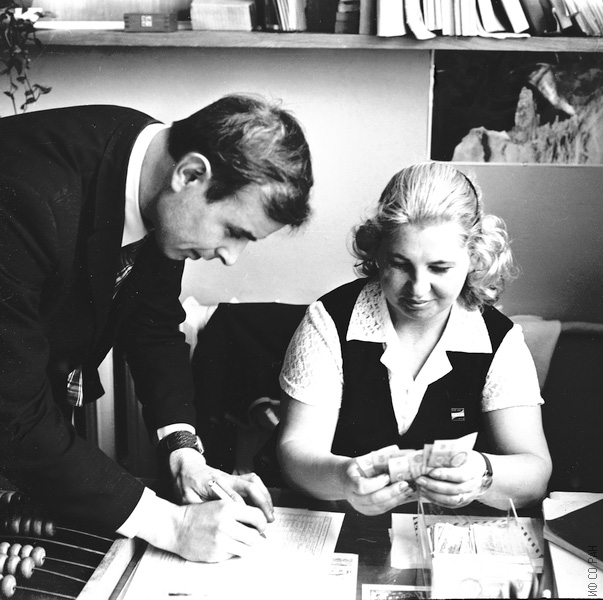 Муссонов В.М. и Чанчикова Н.С., сотрудники лаборатории кристаллофизики Института физики им. Л.В. Киренского Сибирского отделения Академии наук СССР (ИФ СО АН СССР), в день зарплаты. Фото 1974 года. Красноярск.