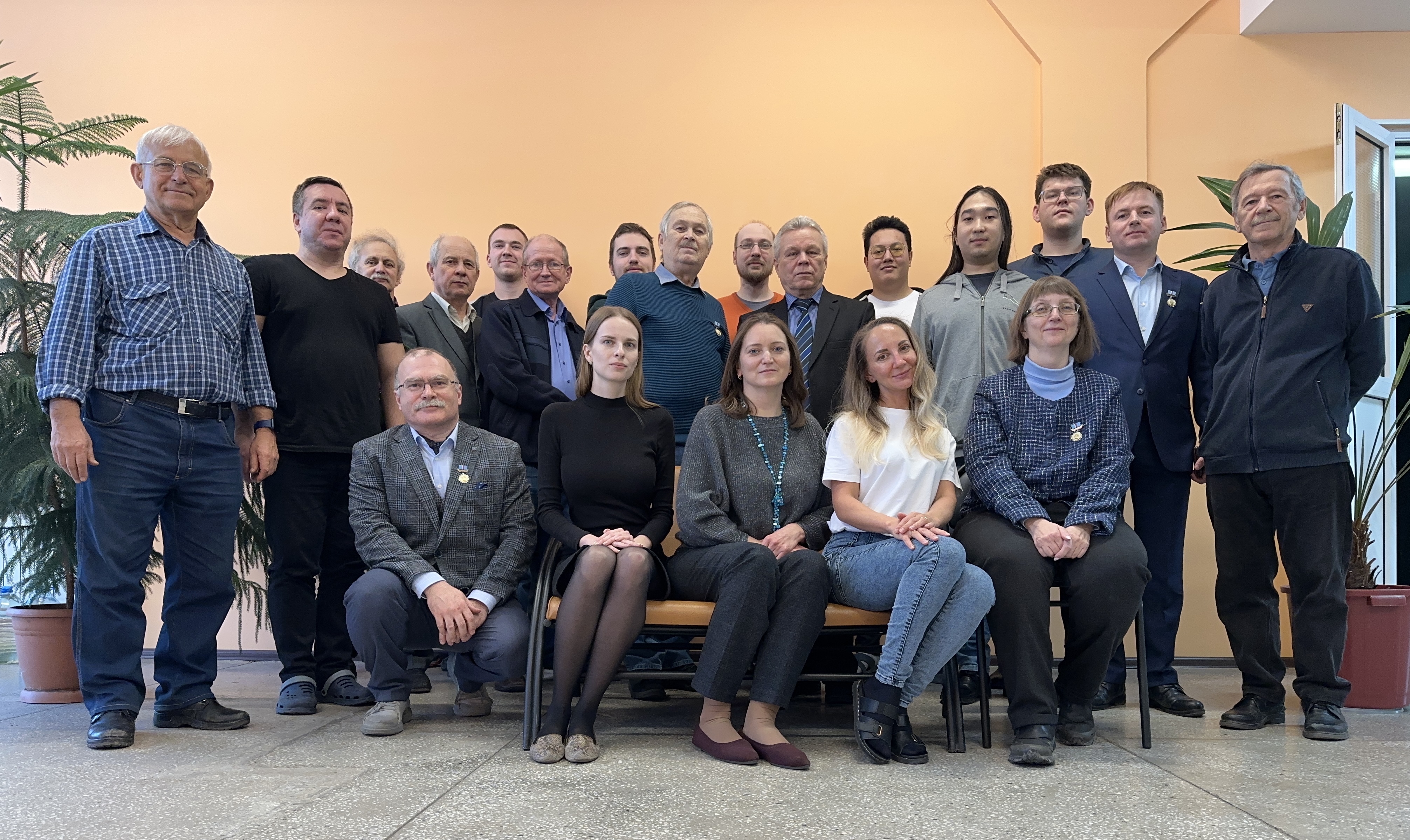 Сотрудники Отдела оптики в день 300-тия Российской академии наук (РАН) 8 февраля 2024 года. Снимок сделан в холле третьего этажа технологического корпуса Института физики им. Л.В. Киренского Сибирского отделения РАН. Стоят, слева направо: Шестаков Николай Петрович, Орешенков Александр Сергеевич, Александровский Александр Сергеевич, Ткачев Александр Михайлович, Костиков Денис Андреевич, Шефер Александр Давыдович, Лесной Максим Александрович, Мысливец Сергей Александрович, Иконников Денис Андреевич, Зырянов Виктор Яковлевич, Абдулаев Абылгазы Сабиралиевич, Дармаев Эрдени Чимитович, Давлетшин Николай Николаевич, Вьюнышев Андрей Михайлович, Гуняков Владимир Алексеевич.
