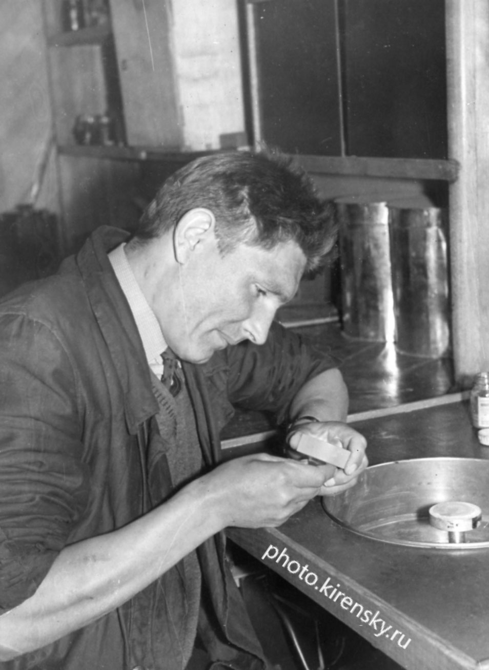 1965 год. На снимке В.А. Некрасов, сотрудник лаборатории кристаллофизики Института физики Сибирского отделения Академии наук СССР (ИФ СО АН СССР) (СО АН СССР с 1991 года СО РАН), за обработкой кристаллов. Работы по выращиванию кристаллов в лаборатории ставили своей целью обеспечить объектами исследования физических свойств экспериментальные работы лаборатории кристаллофизики и другие лаборатории института. Красноярск.