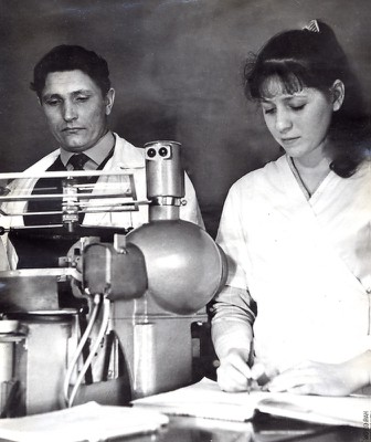 обучает лаборанта Кузину Г. изготовлению и ориентировке образцов для эксперимента, фото 1972 года. Красноярск.