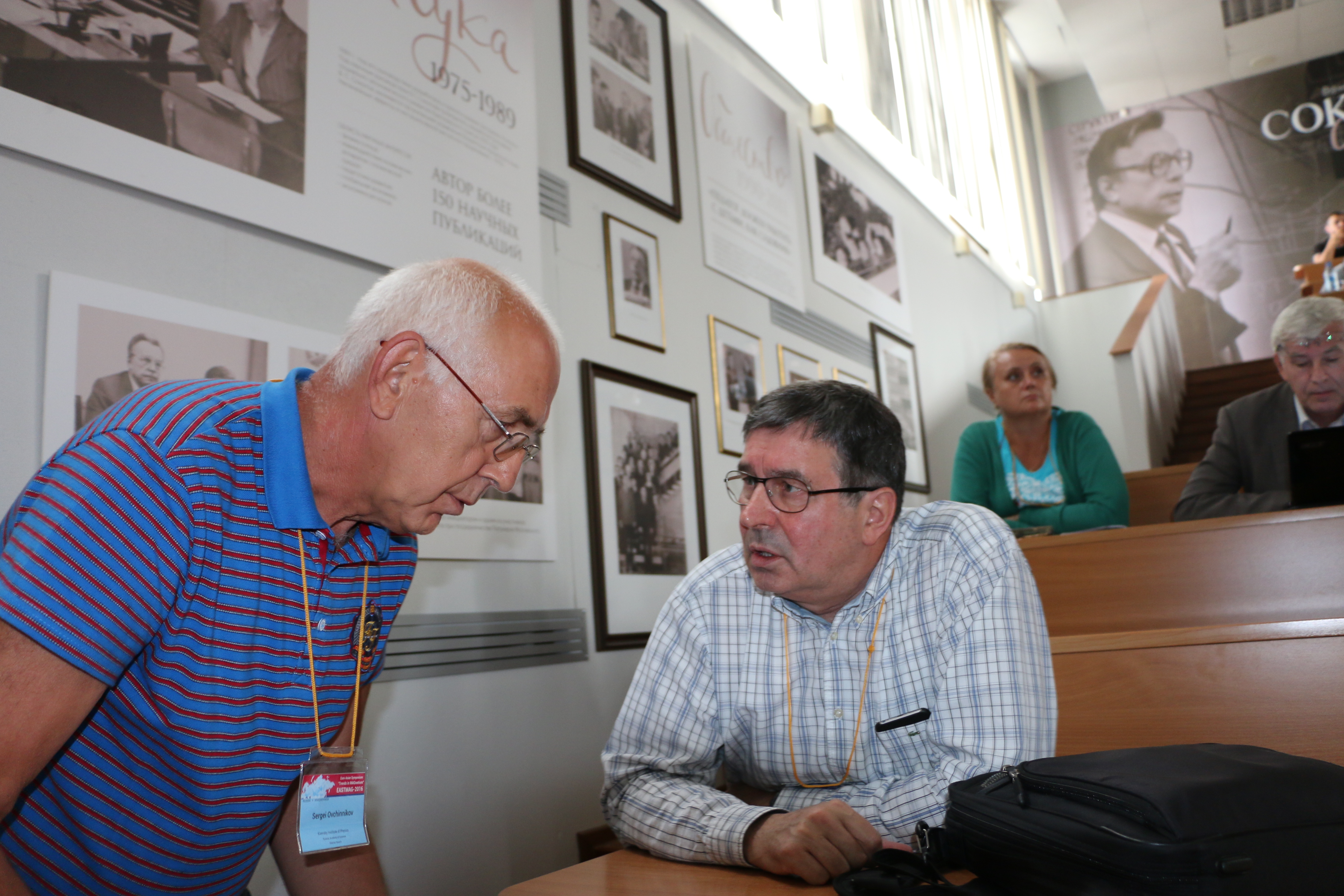 Заместитель директора по научной работе Института физики им. Л.В. Киренского Сибирского отделения Российской академии наук (ИФ СО РАН) Сергей Геннадьевич Овчинников (слева) и директор Института автоматики и процессов управления Дальневосточного отделения Российской академии наук (ДВО РАН) Александр Александрович Саранин на Евро-Азиатском симпозиуме "Прогресс в магнетизме" (EASTMAG-2016), организованном и проведенном 15-19 августа 2016 года в Красноярске.