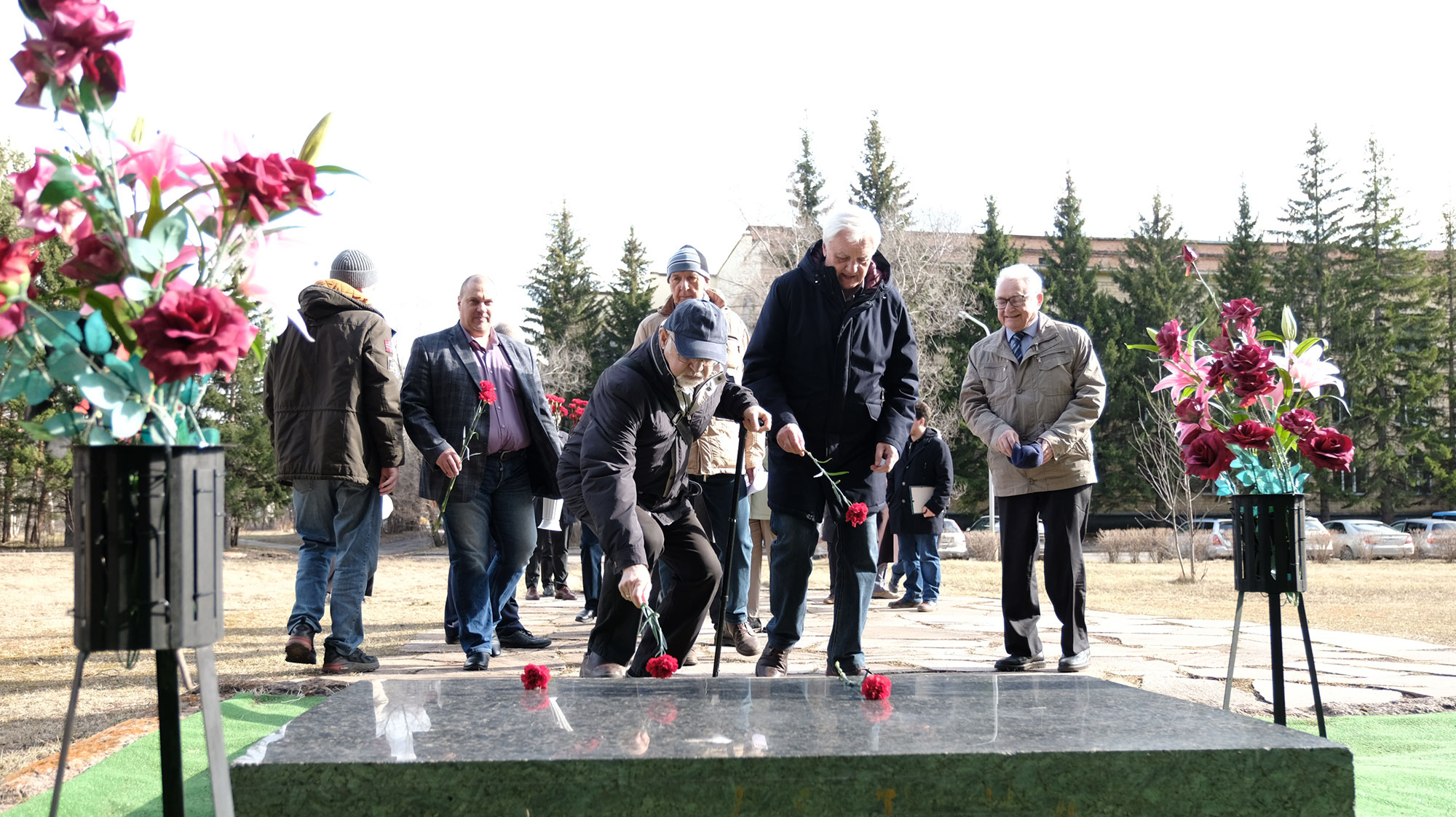 В конференц-зале Института физики им. Л.В. Киренского Сибирского отделения Российской академии наук (ИФ СО РАН) ежегодно в день рождения академика Леонида Васильевича Киренского, организатора и первого директора института проходят научные чтения на расширенном заседание ученого Совета, посвященного его памяти. В 2025 году исполнилось 116 лет со дня рождения академика. По окончанию ученого Совета традиционно возлагаются цветы на могилу Леонида Васильевича. Он похоронен на территории института, носящего его имя в Академгородке Красноярска. На снимке, слева направо: С.Г. Овчинников, заведующий лабораторией физики магнитных явлений, возлагает цветы; М.М. Коршунов, член-корреспондент СО РАН, главный научный сотрудник лаборатории физики магнитных явлений; далее А.И. Панкрац, ведущий научный сотрудник лаборатории резонансных свойств магнитоупорядоченных веществ; И.Н. Флёров, главный научный сотрудник лаборатории кристаллофизики и академик В.Ф. Шабанов. 7 апреля 2025 года.