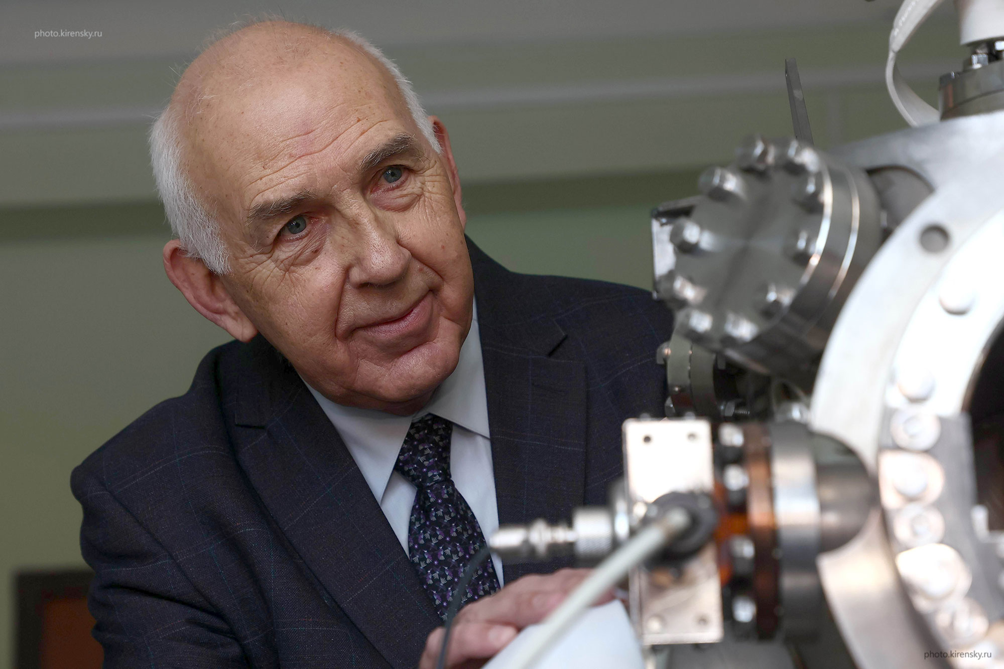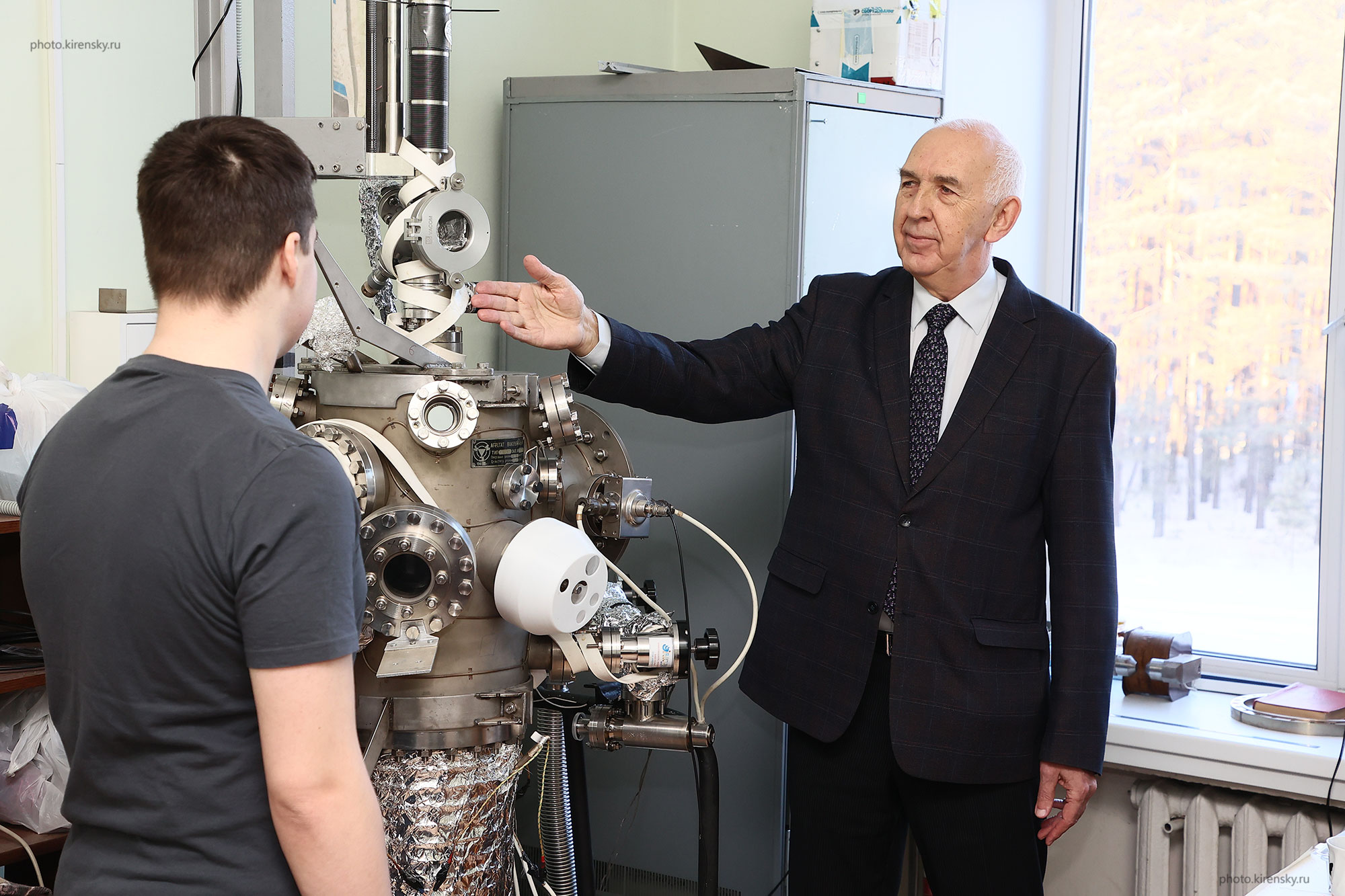 Профессор Овчинников Сергей Геннадьевич, заведующий лабораторией физики магнитных явлений (ФМЯ) Института физики им. Л.В. Киренского Сибирского отделения Российской академии наук в лаборатории ФМЯ, у высоковакуумной установки по получению и исследованию наногетероструктур. Фото 2022 года.