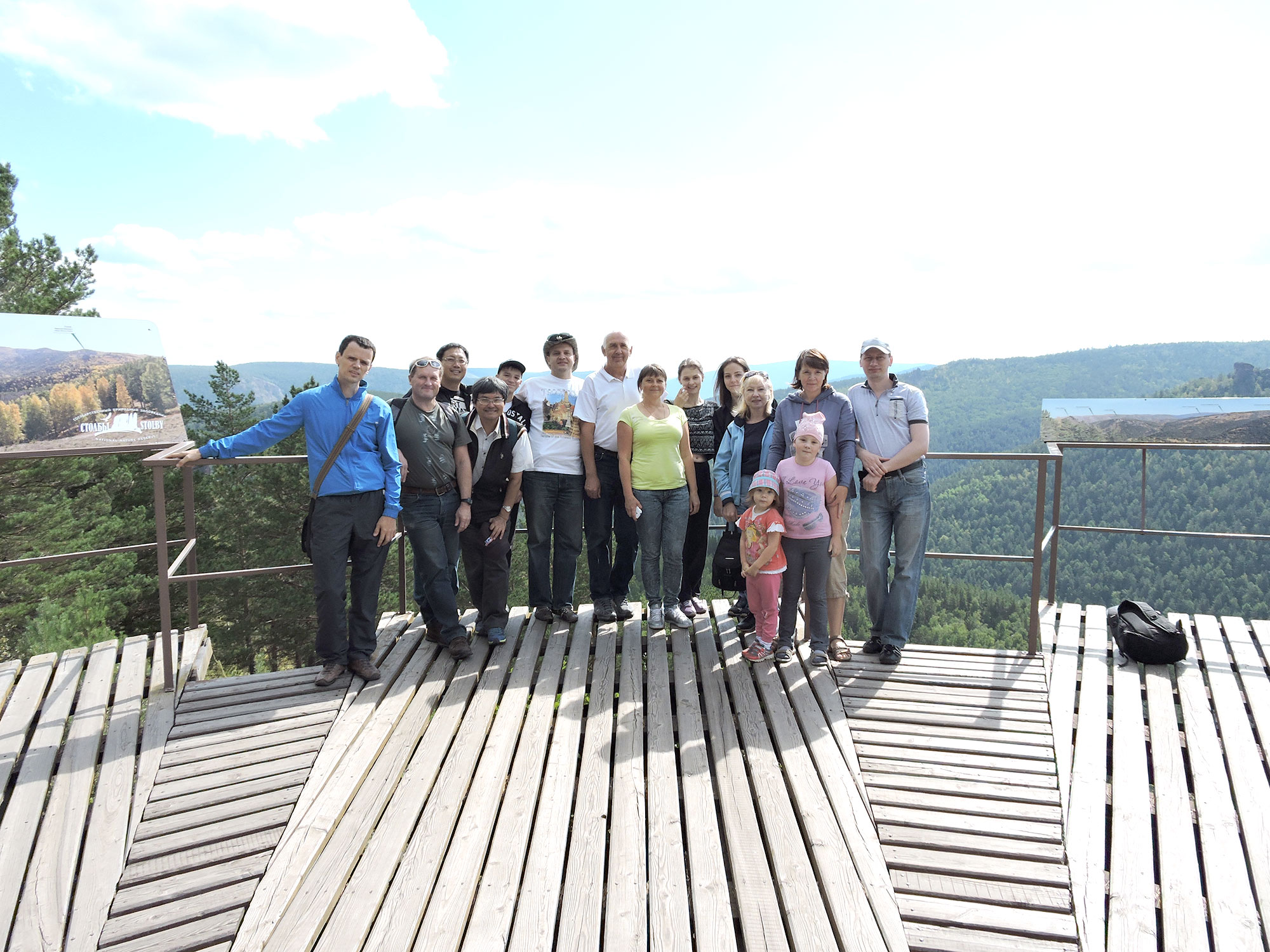 Научные сотрудники лаборатории физики магнитных явлений Института физики им. Л.В. Киренского Сибирского отделения Российской академии наук на экскурсии с коллегами из Тайваня на смотровой площадке заповедника «Красноярские столбы». Красноярцы слева направо: Иванцов Р.Д., Федоров А.С. 6-ой - Томилин Ф.Н., Овчинников С.Г., Яковлева Е.В., ?, Шугарева И. Бруштунова О.Н., Иванова О.С. с детьми, Николаев С.Н. 2015 год.