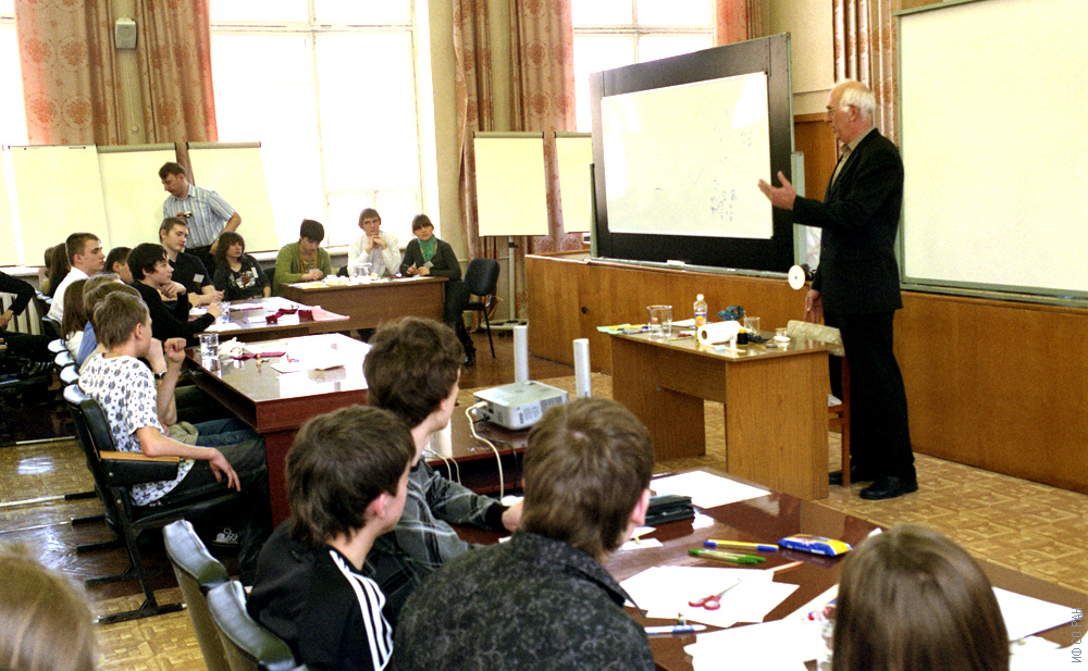 На викторине по физике среди учащихся школ Красноярска и Красноярского края, посвященной 100-ию со дня рождения академика Л.В. Киренского, выступает профессор Г. С. Овчинников, заместитель директора по научной работе, заведующий лабораторией физики магнитных явлений Института физики им. Л.В. Киренского Сибирского отделения Российской академии наук (ИФ СО РАН), фото 2009 года.